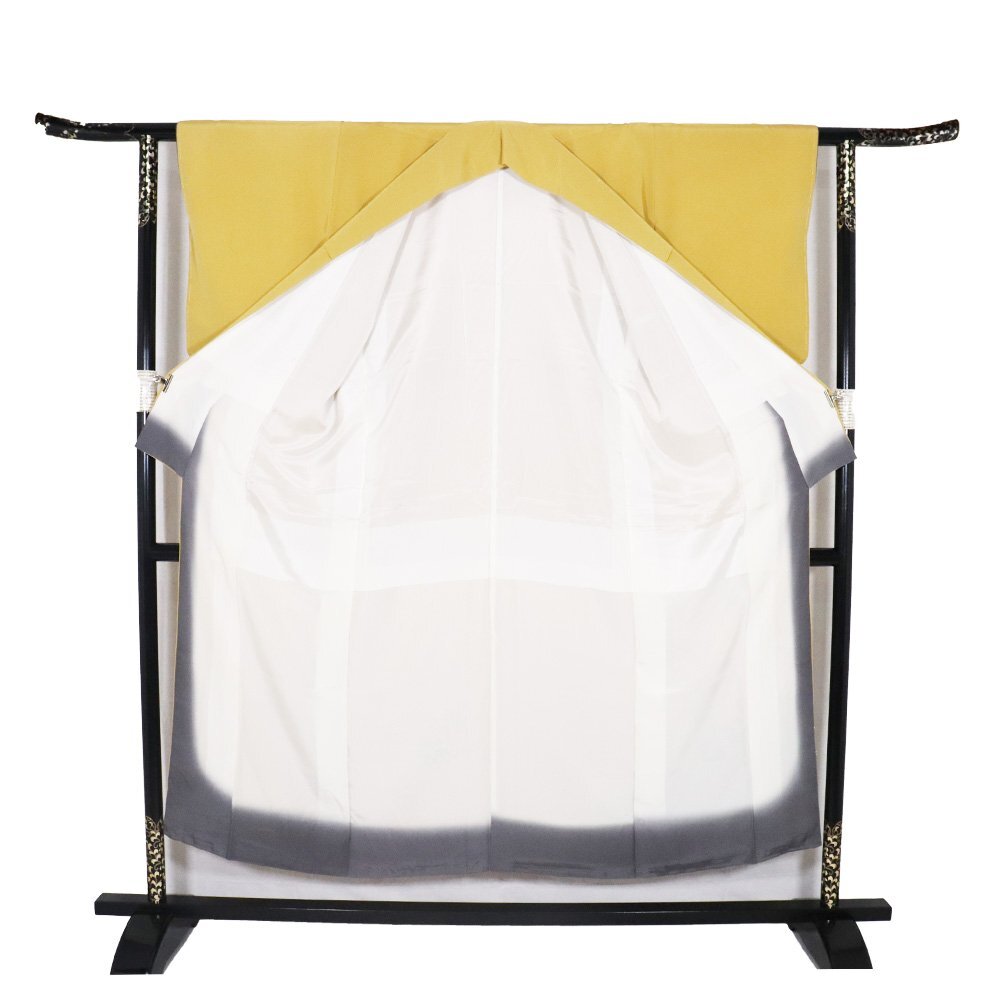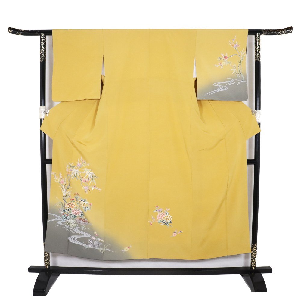 | 訪問着 袷 丹後縮緬地 黄土色(黄朽葉色)・グレー紫(濃色)暈し地 茶屋辻・草花 梅・笹・牡丹・タンポポ 155 広襟 仕付け付き |