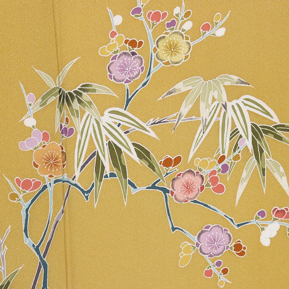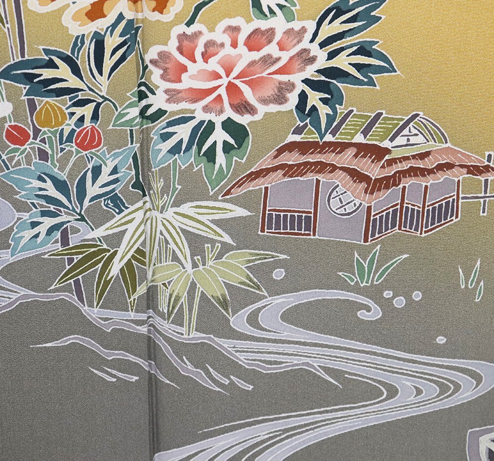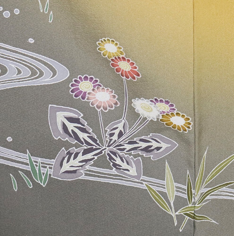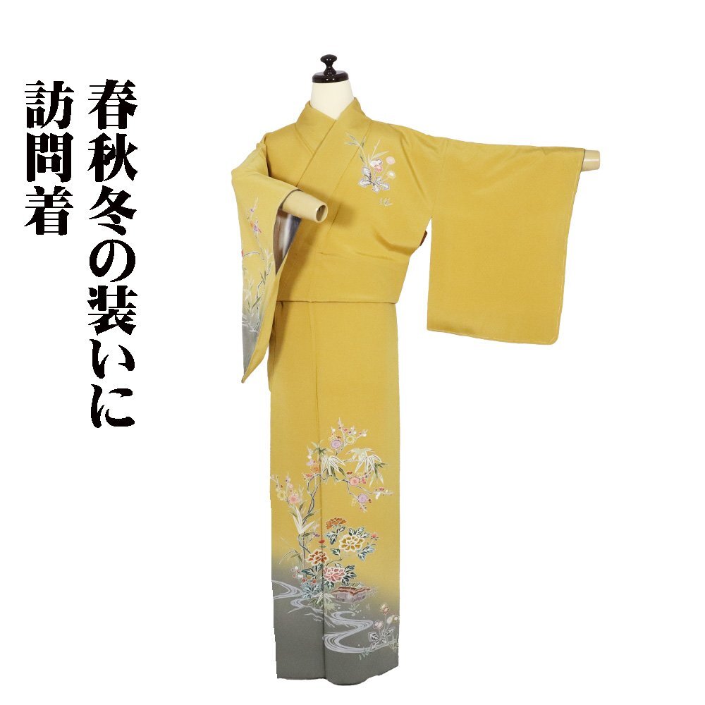 訪問着 袷 丹後縮緬地 黄土色(黄朽葉色)・グレー紫(濃色)暈し地 茶屋辻・草花 梅・笹・牡丹・タンポポ (写真では上手く色が出ない場合があります。ご了承下さい) |