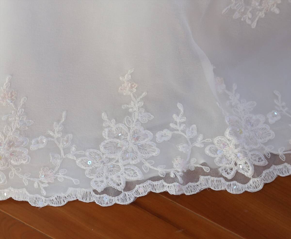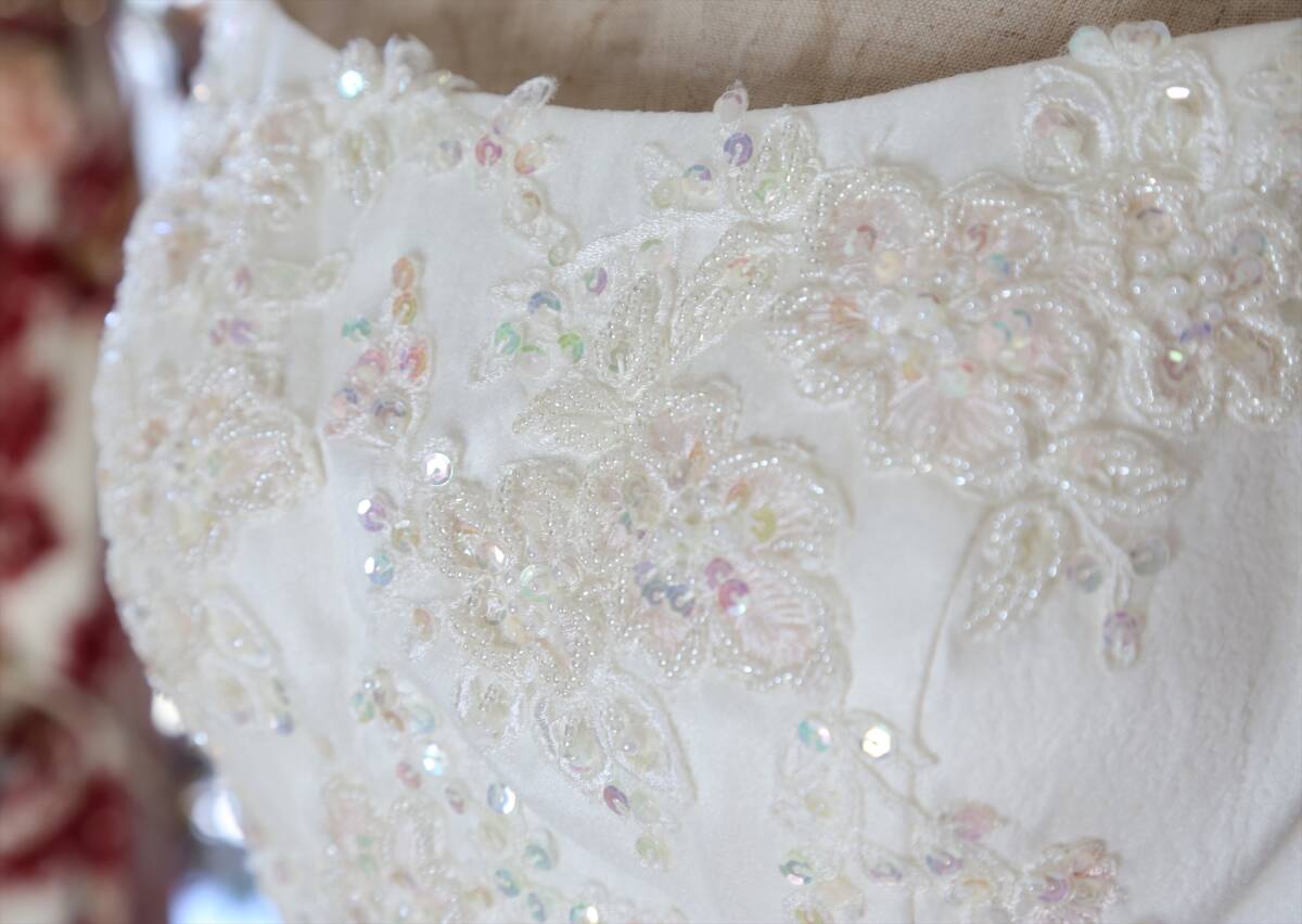 お色はアイボリーで、刺繍が沢山施されていますが、全部の刺繍が白ではなく、刺繍の中心の方の糸など一部薄い桜ピンクの糸が使用されています
