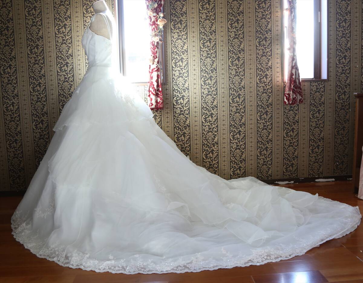 実寸はバスト約85cm、ウエスト約64cm、前中心から裾までの丈約140cm、脇下から裾までの丈約150cm、後ろ丈約242cm、多少の誤差はご了承ください