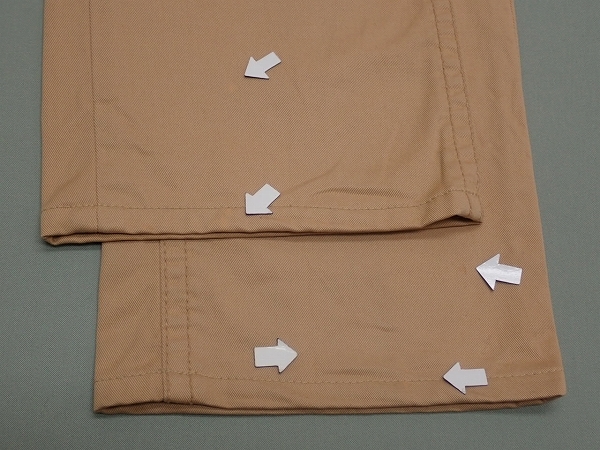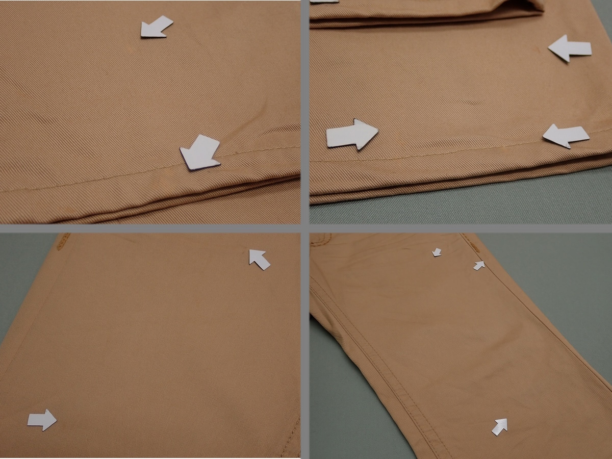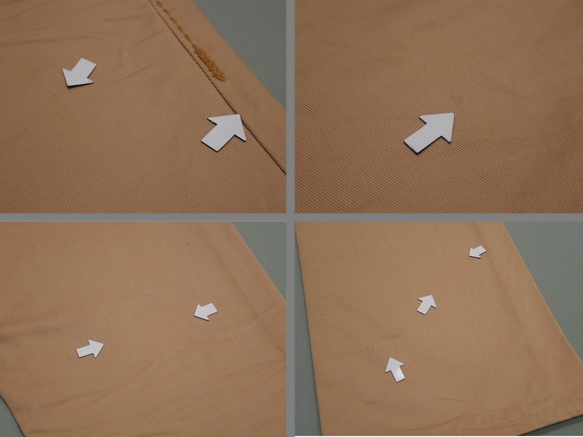 こちらの商品は中古品です。使用感があり全体にシワ跡が見られます。 腿からひざ、裾にかけて汚れや色落ちが見られます。ポケットの内布に汚れが見られます。 右腿裏や右後ろ裾家周りにシミ汚れが見られます。 | |