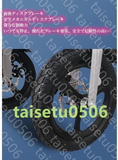 商品の説明?仕様 -フレーム材質:アルミニウム合金 -フォークタイプ:スプリングフォーク -ブレーキシステム:フロントデュアルディスクブレーキ、リアドラムブレーキ -推進モード:チェーン -ペダル:折りたたみペダル -ホイール:14インチ -耐荷重:150kg 配送方法:この商品は大型のため、海上輸送を使用し、納期は15?30日です。 ?商品についてご不明な点がございましたら、お気軽にお問い合わせください。すべてのお客様に心よりお礼申し上げます。
