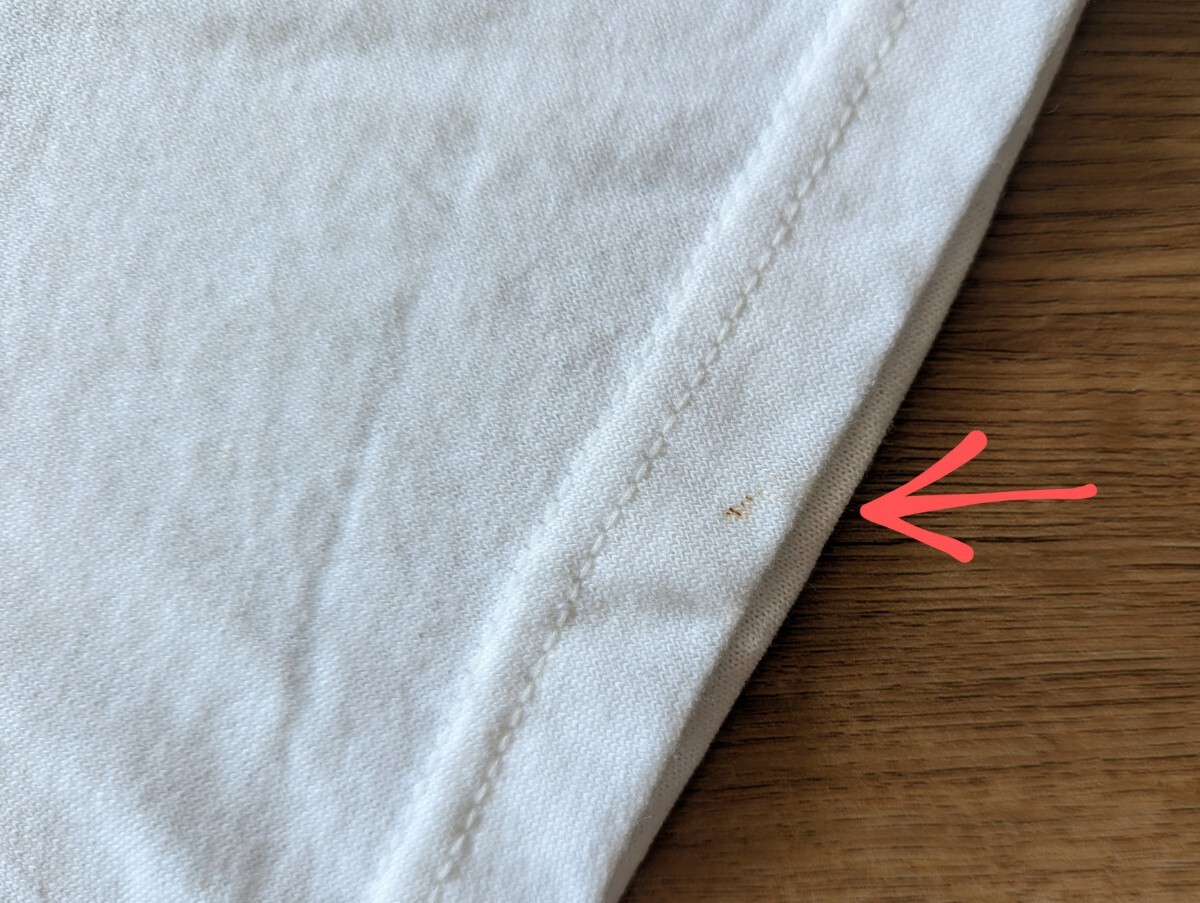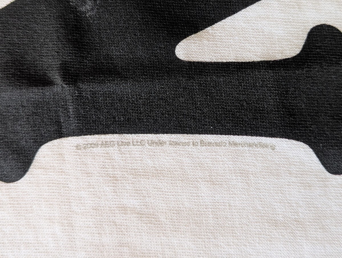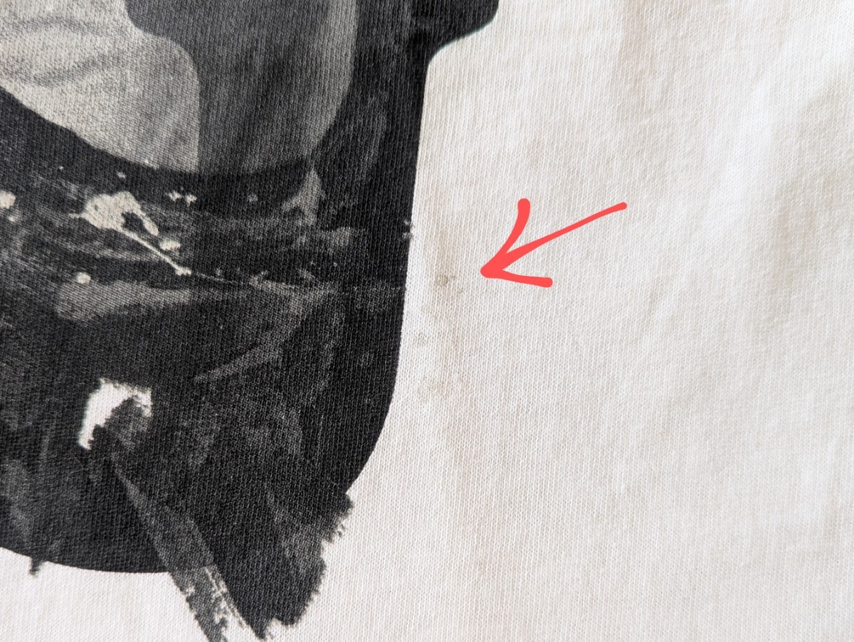 ● コンディション:着用感はありませんが、前身頃プリント部分にプリント?なのか薄い汚れ(シミ)があります。右袖口(うしろ側)に汚れがあります。その他、保管時によるシワがありますが、概ね良好な状態を留めている様に思います。