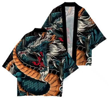 女性のための伝統的なプリント着物,日焼け止め,快適なカーディガン,柔らかい生地,ビーチや休暇用 色: 黒 龍 サイズ:S