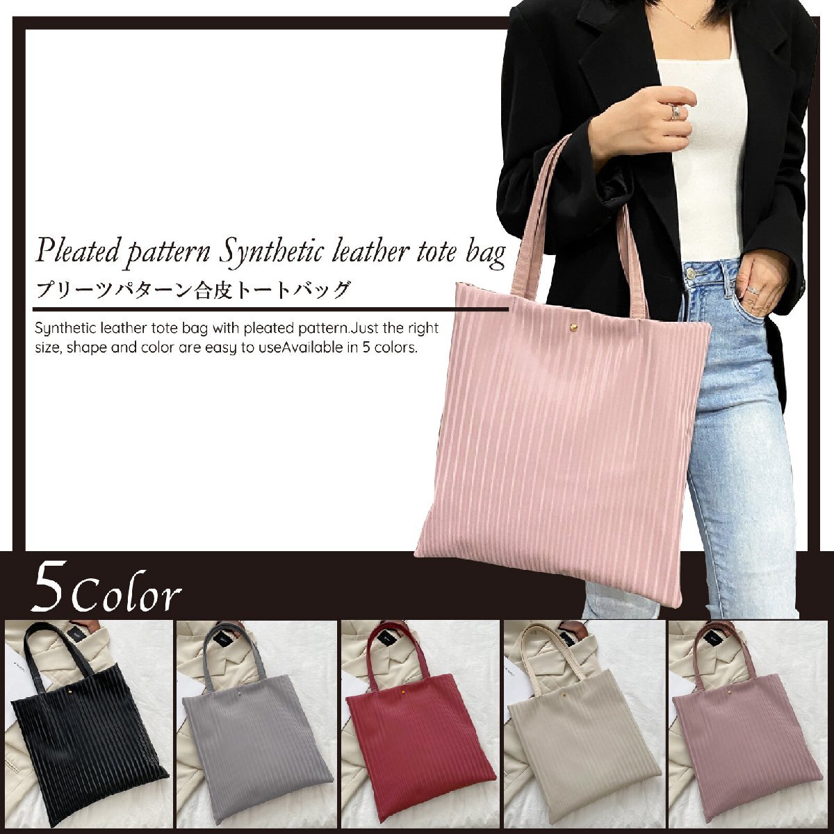 必要な物だけ持ち歩くのに便利なハンドバッグはデイリー使いやちょっとしたお出かけだけでなく旅行の際のサブバッグなどにも活躍してくれる優れモノビジネスシーンでの書類を入れたりお稽古事などにも。フェミニンな印象の素敵なバッグです。ファスナー付きで中身を落とす心配もない安心設計。表面にさり気なく、プリーツになっている生地でデザイン性のあるオシャレなバッグです。サイズ:縦 約35cm・横 約35cm素材:合成皮革カラー:ピンク