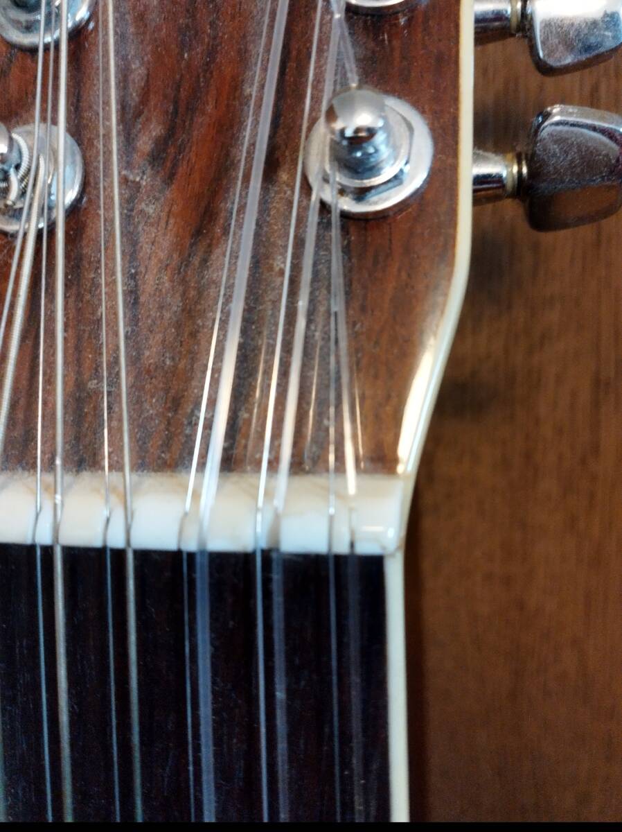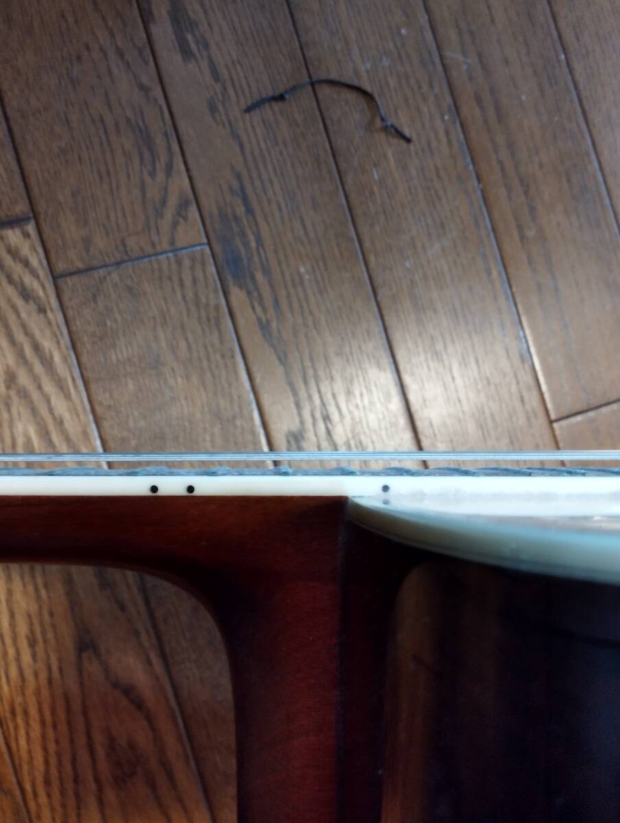 ナットの2弦部分が欠けている為、交換が必要です。3,2,1弦の副弦にナイロンが張ってあります。
