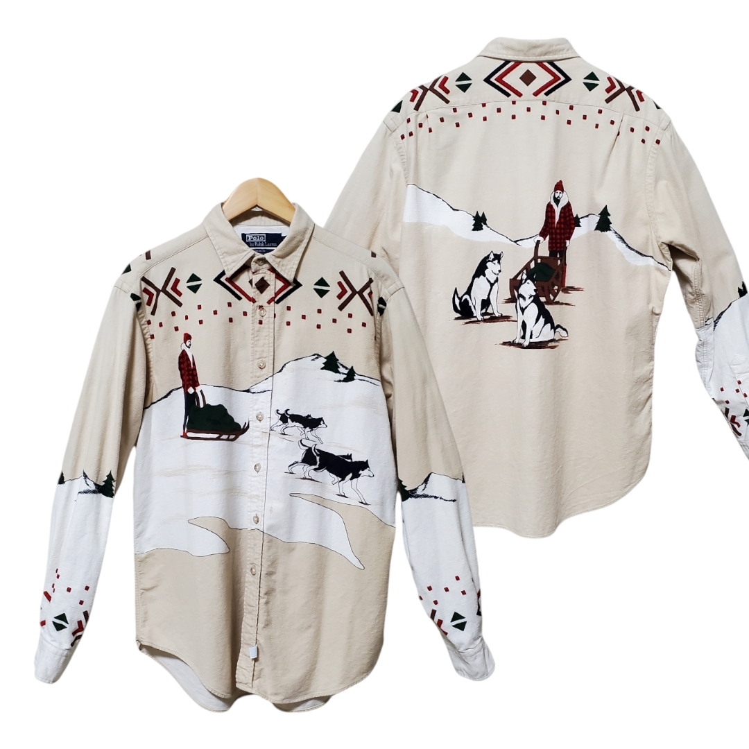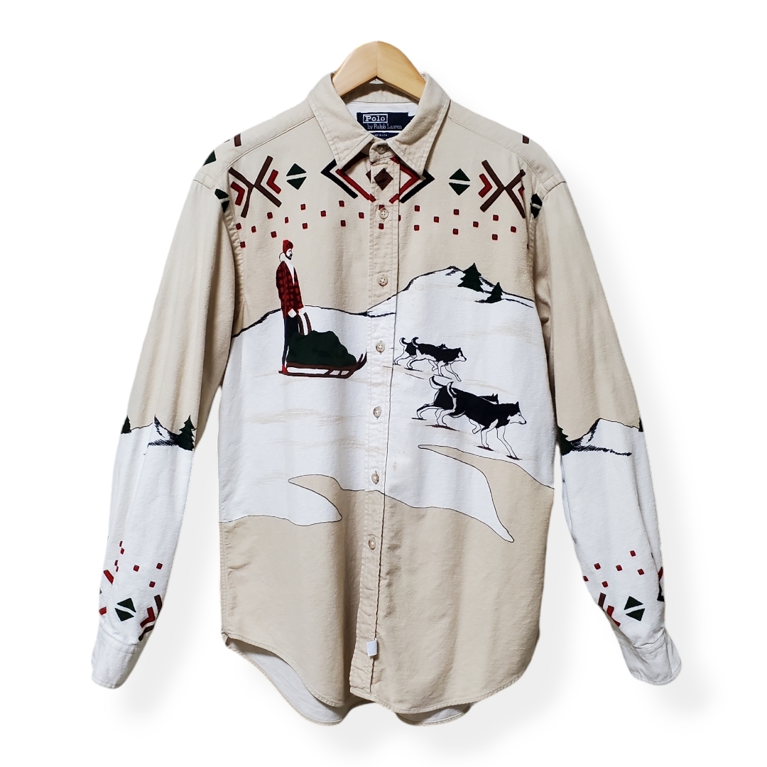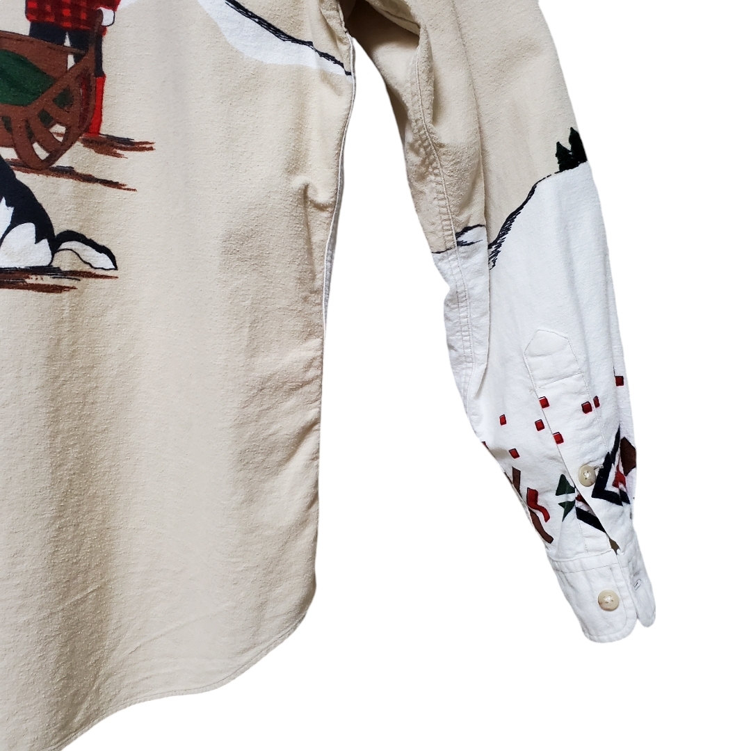 【USA製 入手困難 クリーニング済】 RALPH LAUREN ポロ ラルフローレン 総柄 長袖シャツ シャモアクロス フランネルシャツ エスキモー 犬柄