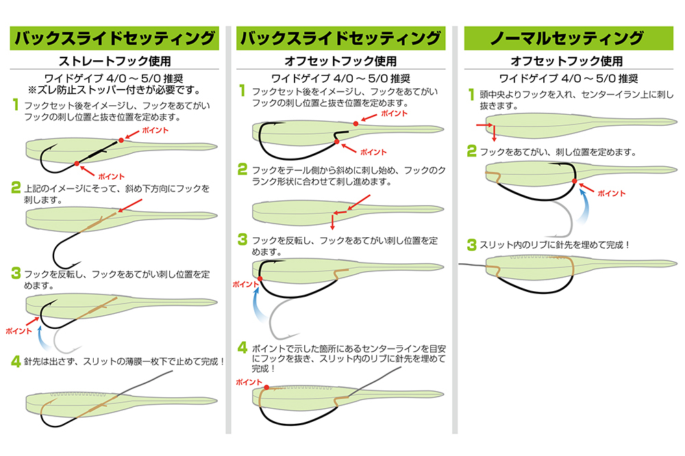 | 新品になります。 商品画像欄には、参考画像として、色違いの画像を使用しております。こちらは1枚目のパッケージの商品となります。 パッケージの仕様は変更になる場合がございます。 ■必要から生まれたファットモデル ドライブスティックは本来、バックスライドでの使用を想定して開発されたワームではない。しかし「フックを逆から刺すとバックスライドするのでは?」という発想から生まれた高い食わせのポテンシャルは「とにかく釣れる!」ことから、むしろバックスライドワームとしての実績を積み重ね続けている。 他に類を見ない、ヨタヨタと身をよじらせながらテールを左右に振るバックスライドフォールは、無防備に泳ぎ進む小魚や漂うエビをイミテート。そして着底後に「チョン!」と跳ね上げれば、キックバックして逃げるエビやザリガニの動きを演出し、フォールで食わせきれなかったバスをも瞬間的に反応させてしまう。しかし、カバーに滑り込ませていくアプローチにおいて、4.5インチの自重(約8.4g)をもってしても、強風時、またはリールの性能次第では弾道が浮いてキャストが決まりにくい、もしくは狙いのスポットまであと一歩届かない、といったシーンに直面することがある。 かといって6インチにすると自重は十分だが、そのボディサイズゆえ狭い隙間に入りにくい。ドライブスティックならではのライブリーな自発的フォールアクションはそのままに、もっとキャスタビリティとカバー突破力に優れたモデルが欲しい!そんな欲求から生まれたドライブスティックファット4.5インチは、理想的な自発的アクションを発生するボディシェイプを追求したうえでファット化。オリジナルモデルの4.5インチとほぼ同寸ながら、約3gの重量アップ(約11.4g)に成功した。 カバーへの快適かつストイックなアプローチを実現し、遠方のスポットも射程範囲内に収める。また、重量アップによりバックスライドフォールの推進力も強まることで、16ポンドクラスの太めのラインの抵抗にも負けることなくカバーの奥へと侵入していく。もちろん、頭からフックを刺すノーマル刺しでも威力を発揮。トゥイッチングによるダートアクションとテールを細かく震わせるフォールアクションの組み合わせは、その遠投性能と相まって横方向への効率的なチェックにおいてもメリットとなる。持ち味である自発的アクションを100%引き出し、確実なフッキングを決めるうえでも、フックはワイドゲイプ形状の4/0~5/0サイズでお使いいただきたい。 | |