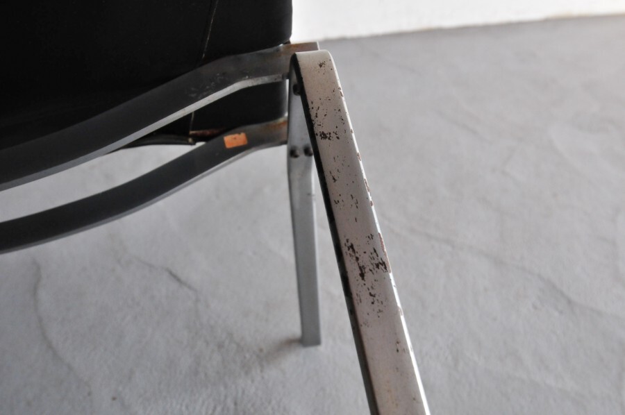 フレームにメッキ剥がれ多めにあり。さびがうっすらある個所もあり数年前に張替えを行い、幾分かエイジングの色・艶がましております。コレクション保管品ですので使用頻度は非常に少なく今後使い込みにより色・艶がさらに増すかと思います。レザーの質感はしっかりと硬さ厚みのある感じがあるのが特徴です。(ソフトで伸びやすい感じのレザーではありません。)