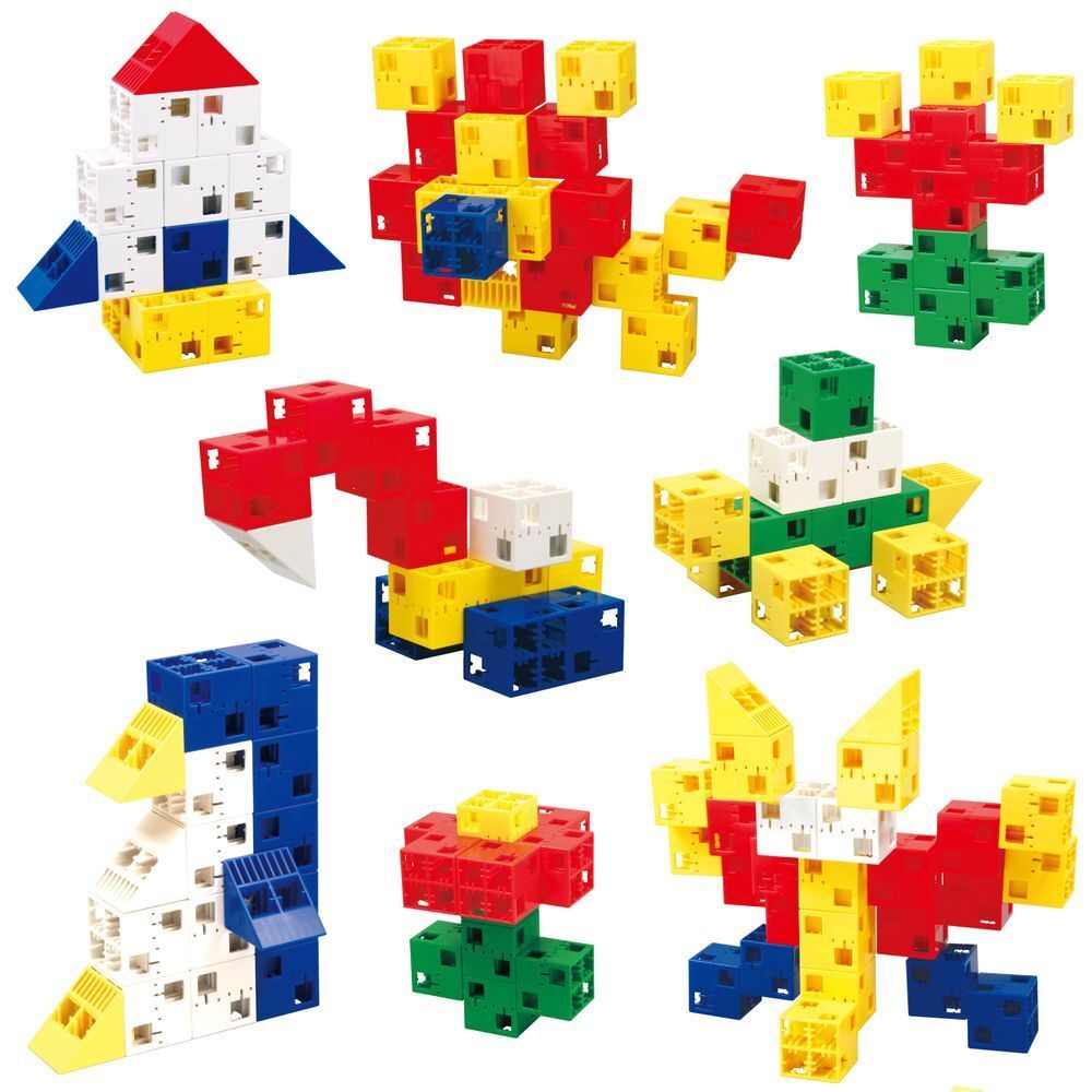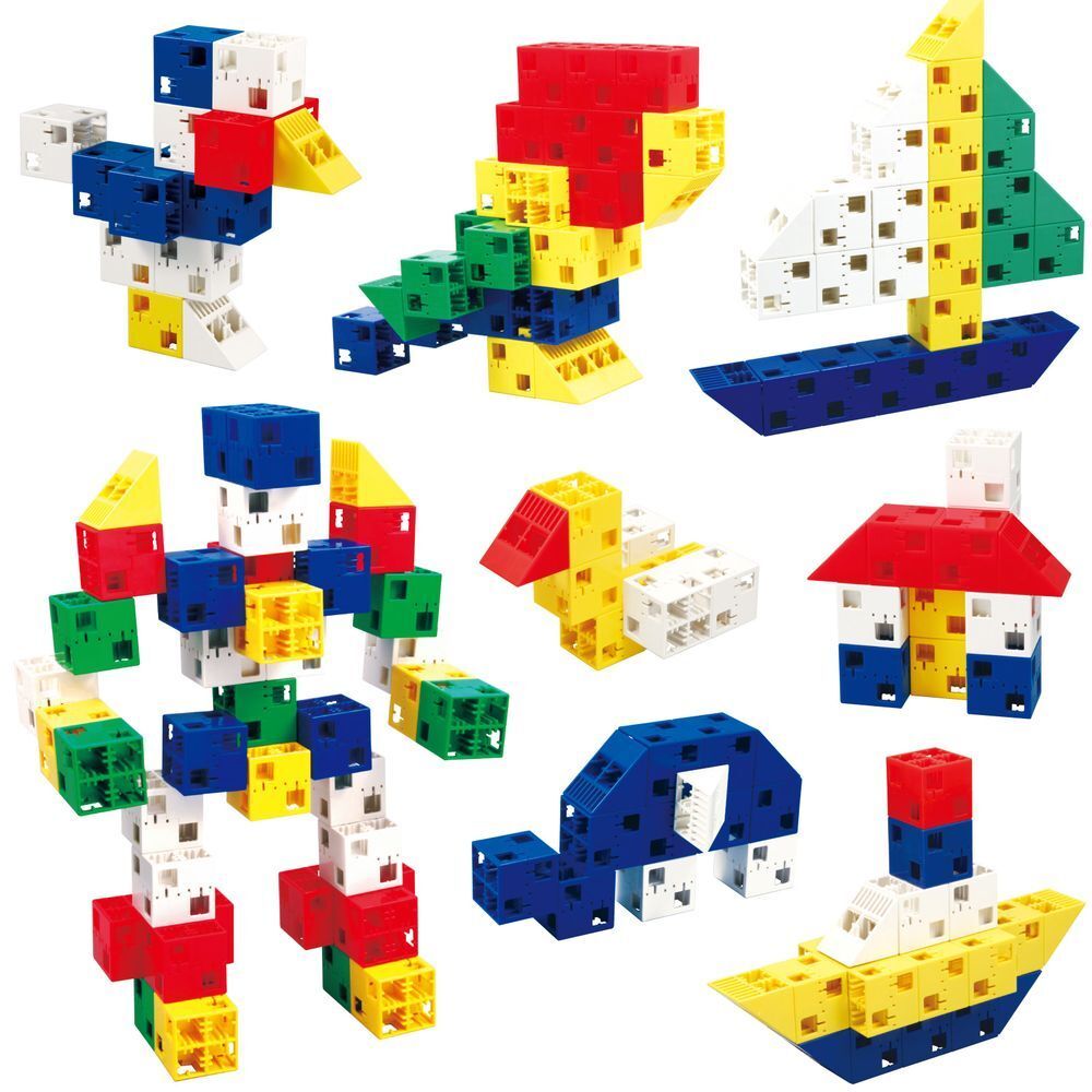アーテックブロックはすべての面に複数の穴があいているので、あらゆる方向にブロックをさしこむことができ、まるで、粘土遊びやお絵かきをするように次々に楽しい作品を作ることができます。