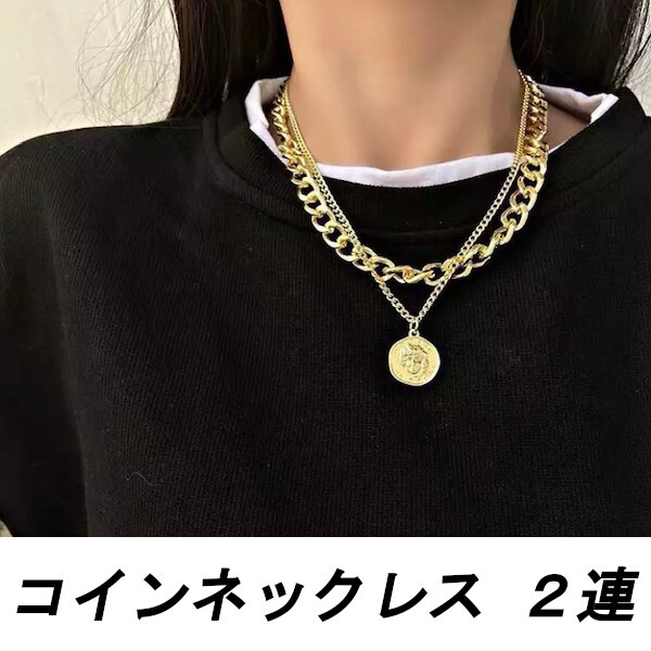 コインネックレス 2連 ダブルチェーン ネックレス レディース ゴールド