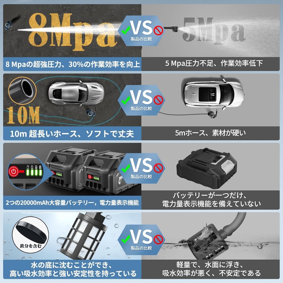 高圧洗浄機【洗車プロ2025強化版新登場 8MPa高圧洗浄機 コードレス 充電式 LED残量表示 PSE認証済み 20000mAhバッテリー2個 マキタバッテリー互換可能 噴射距離10M 軽量節水洗浄機 6in1多機能ノズル 10mホース 収納ケース 日本語取扱説明書 家庭用洗車機 洗車 駐車場 庭 外壁 階段 苔 黄砂 ベランダ 窓 網戸 ガラス 玄関 浴室 墓石掃除