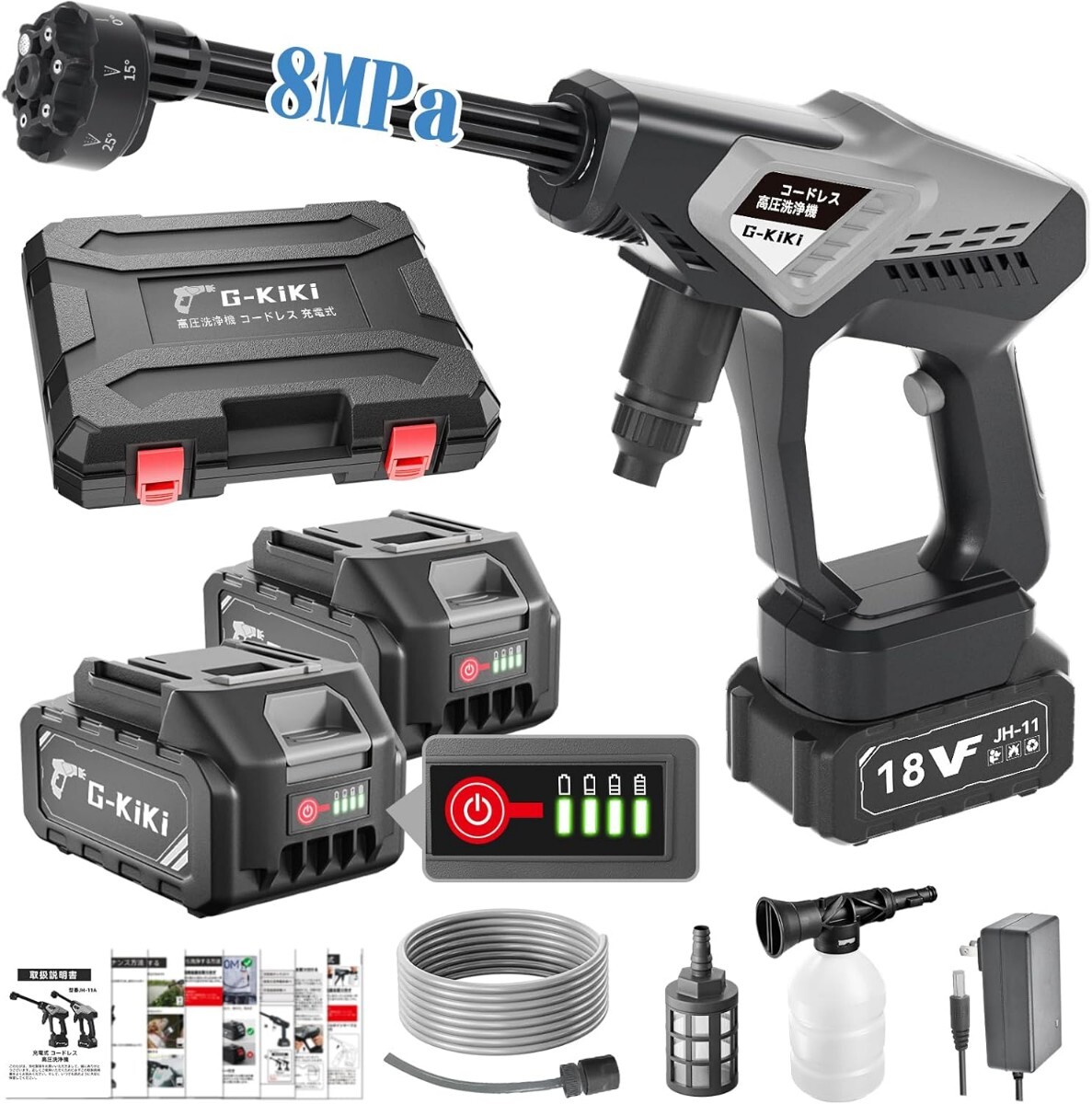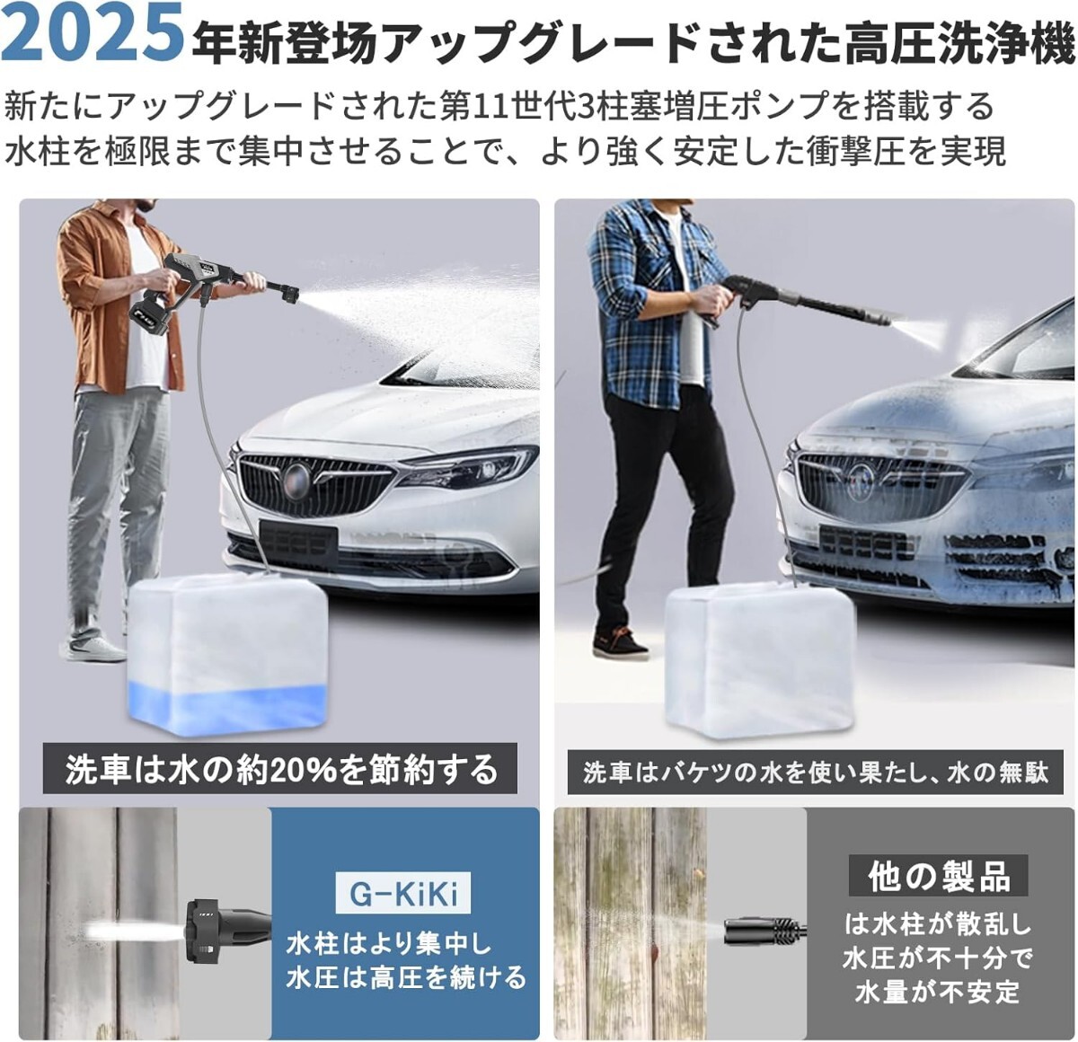 2025年新款登場、第11世代3柱ピストンポンプ、8MPaの強力水圧、節水率20%!】G-KiKiは2025年新モデルとして、さらに進化した高圧洗浄機をお届けします。高性能な純銅モーターを搭載し、8MPaのパワフルな水圧を実現。従来製品よりもさらに効率的な設計で、洗車時間を毎回15分以上短縮可能です。第11世代3柱ピストンポンプの精密な設計により、水流が集中し、安定した強力な圧力で頑固な汚れを簡単に除去します。洗車ごとに約20%の節水が可能で、効率的かつ環境に優しい設計で日常の清掃ニーズに最適です。ご注意:すべての製品は出荷前に100%の品質検査を行っております。初回使用時に少量の水が残っている場合がありますが、性能には影響ございませんのでご安心ください。
