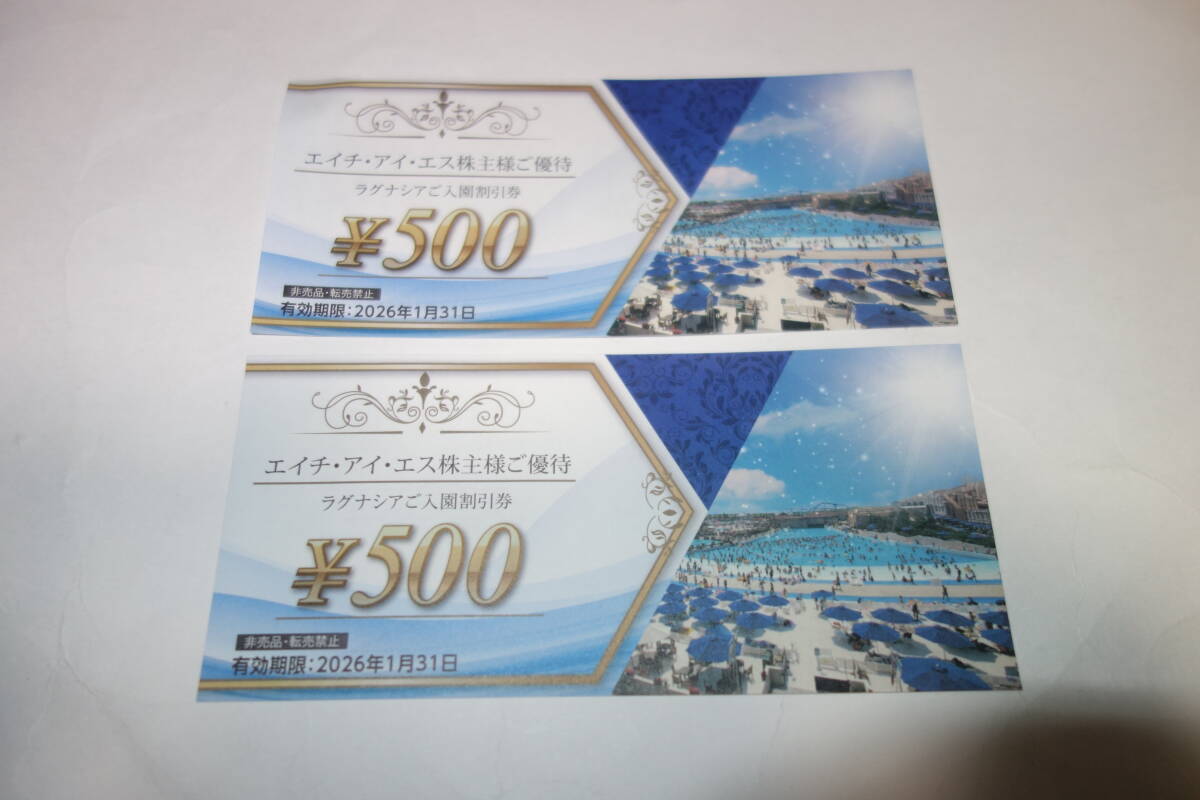 HIS(エイチ・アイ・エス) 株主優待券 ラグナシア 入園割引券 1000円分 (500円券×2枚)