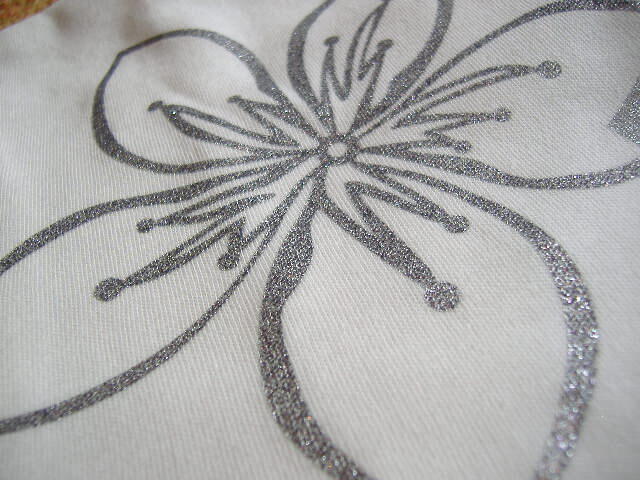 大小3つのプルメリアが、ラメのプリントで描かれています。