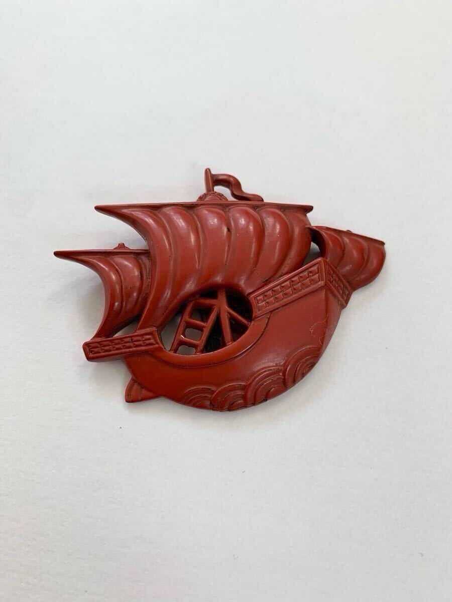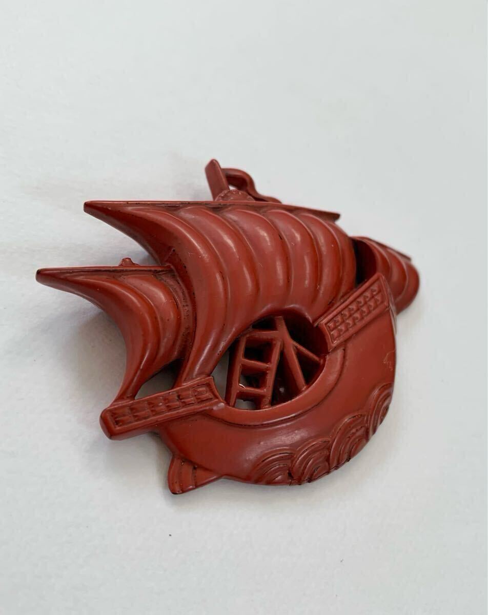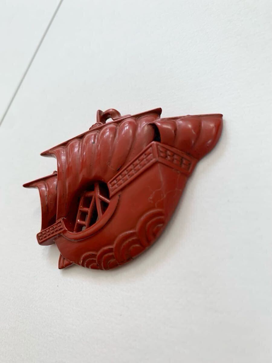 しっとりとした朱赤と宝船のようなデザインが印象的な鎌倉彫りの帯留のご紹介です。