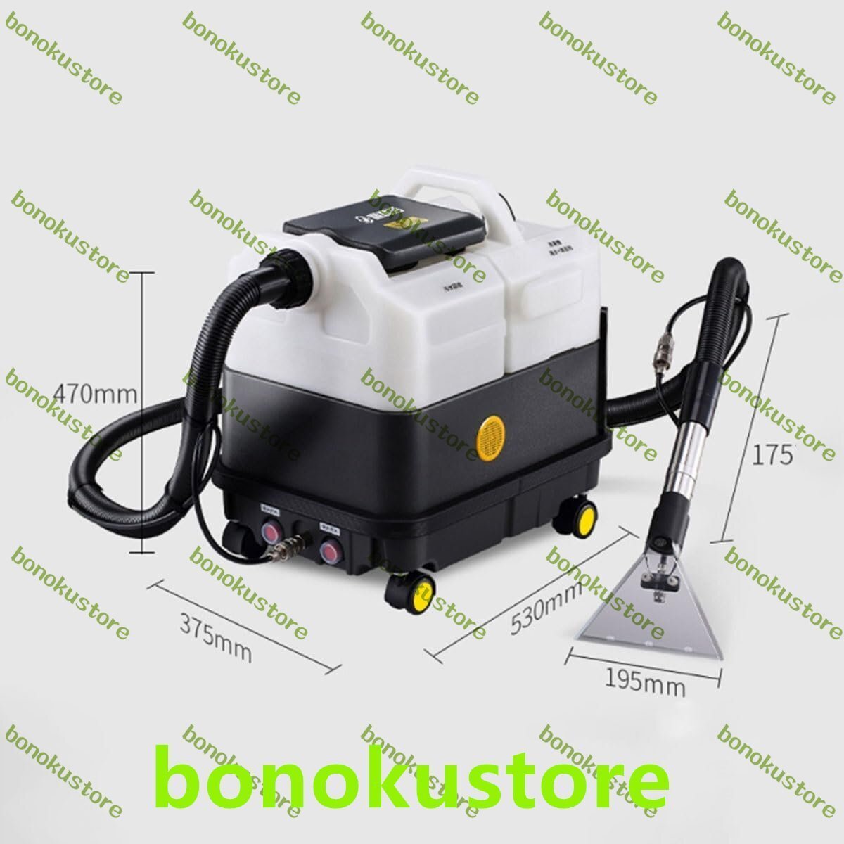 【商品仕様-カーペット用掃除機】:定格電圧:110V、吸水量:1000W、蒸気量:1500W、騒音:75デシベル、汚水タンク:9L、浄水タンク:9L、研削ヘッド回転数:0-150r/min、吸引力:23kpa、ワイヤー長さ: 10メートル、ホース長さ:2メートル、製品重量:15kg、研削ヘッド重量:2kg。