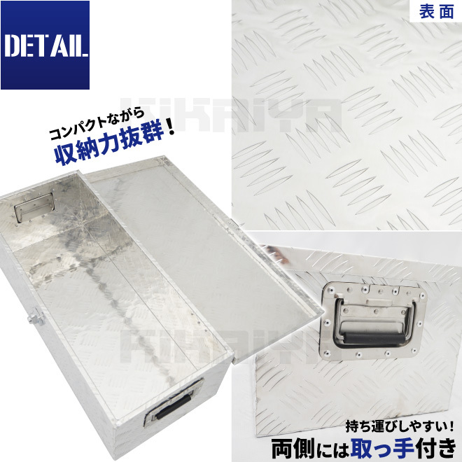 ●アルミ製で非常に軽く持ち運びに便利 ●軽量で錆に強いアルミ製 ●収納力が抜群で使い方様々 ●車の荷台に載せても重宝します ●取っ手やヒンジはスチール(メッキ)です ●キーシリンダーを左に回すだけで素早くロックできます ●鍵を抜いた状態でも回すだけで簡単にロックがかかりますので鍵の取扱いにご注意下さい ●本体上面はフチの折り返しにより雨水が侵入しにくい構造になっております |
