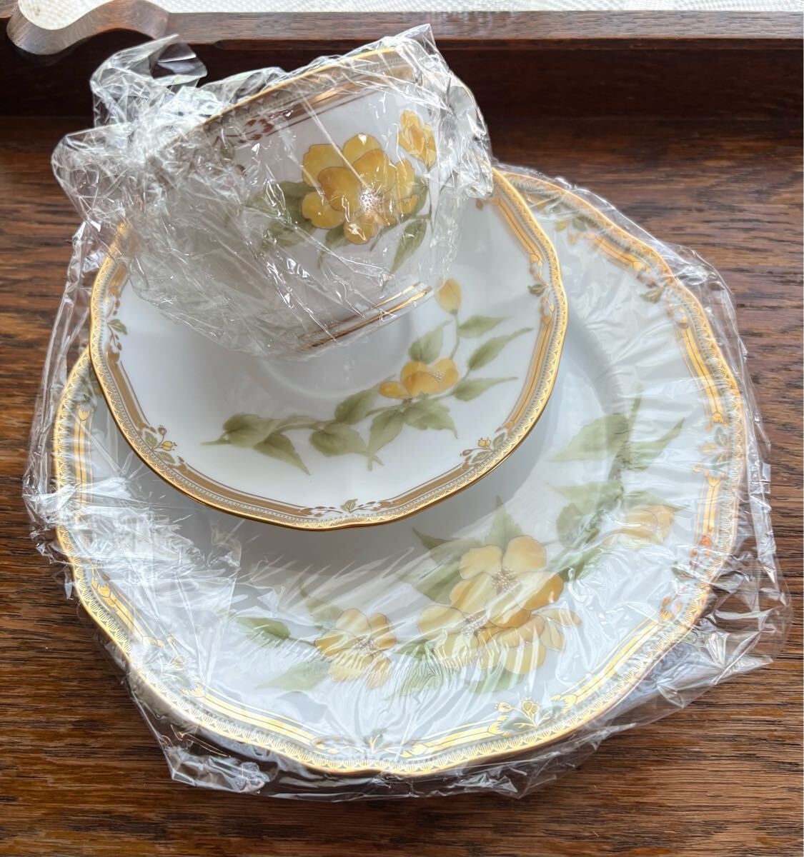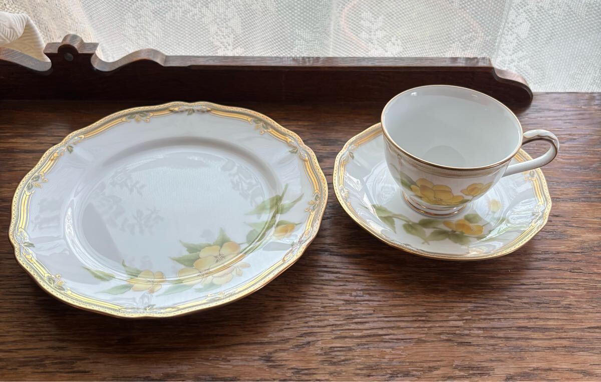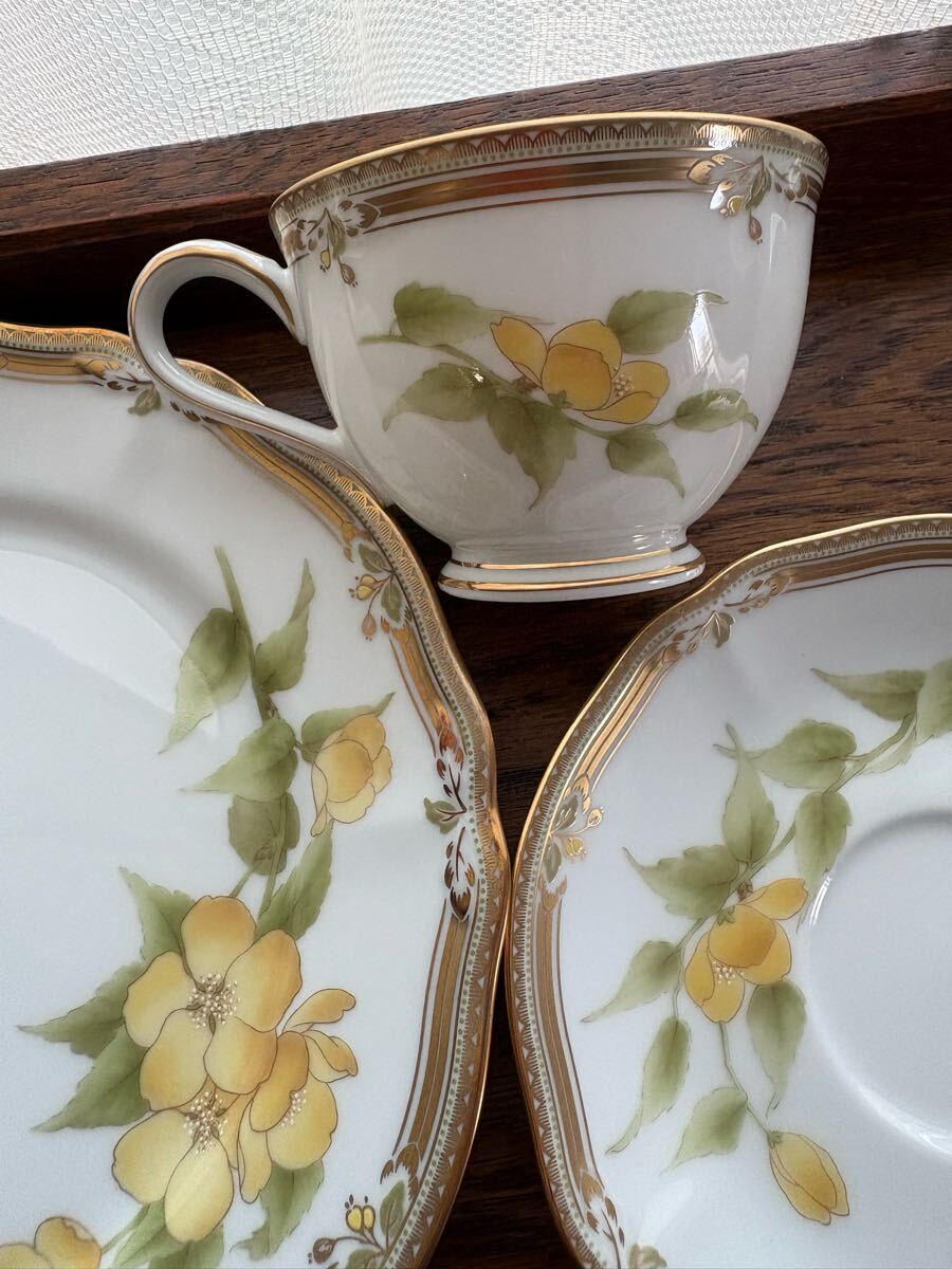 ノリタケ ガラコンテッサ 山吹の花 トリオ カップ&ソーサー デザートプレート 山吹 黄色い花 新品未使用品 縁起 金運