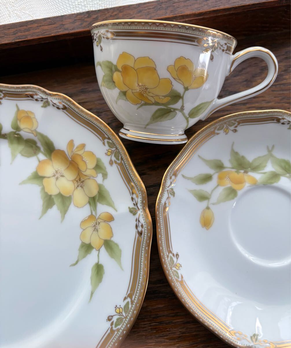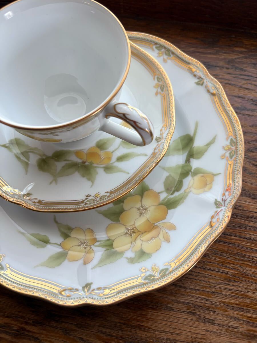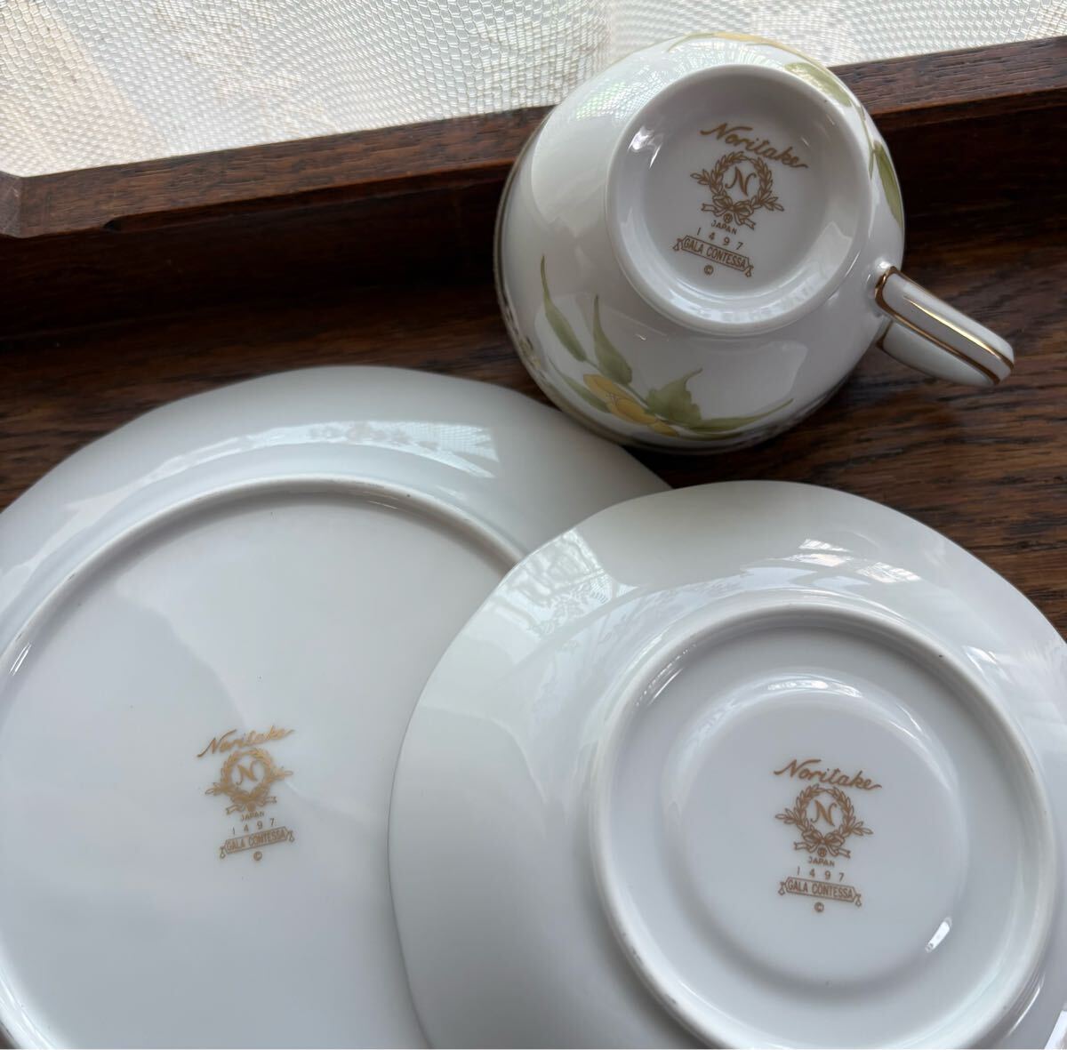 ノリタケ ガラコンテッサ 山吹の花 トリオ カップ&ソーサー デザートプレート 山吹 黄色い花 新品未使用品 縁起 金運