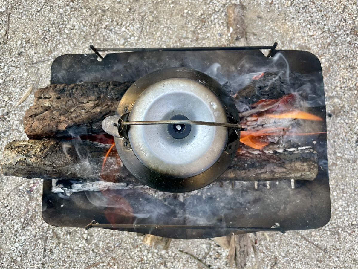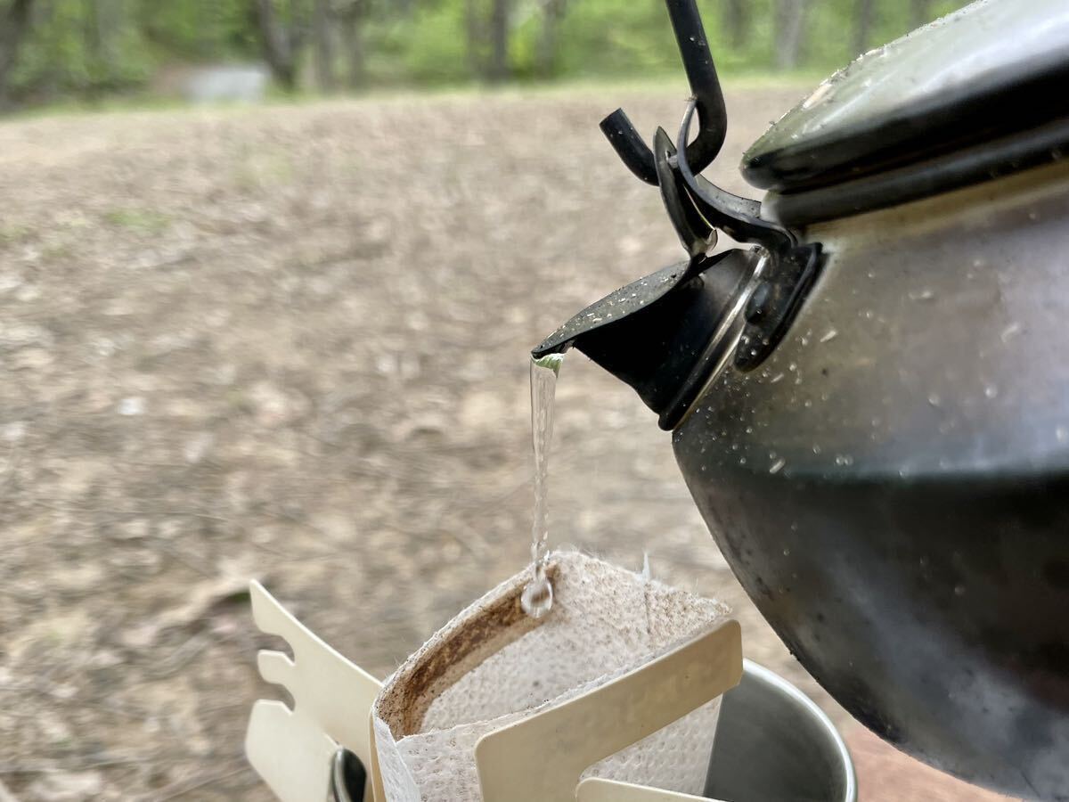 ※蓋は取手の先にシンプルに引っ掛けるだけです、ケトルを90度以上に極端に傾けると口蓋が落ちるのでご注意下さい。最後の約10mlは90度以上に傾けないと水が出ないため、その際は口蓋が落ちないように指で添えるか、外してからご使用下さい。また、焚火使用の際、裏側に煤がたまると水が垂れる場合があります。その場合には煤を拭き取ってご使用下さい。
