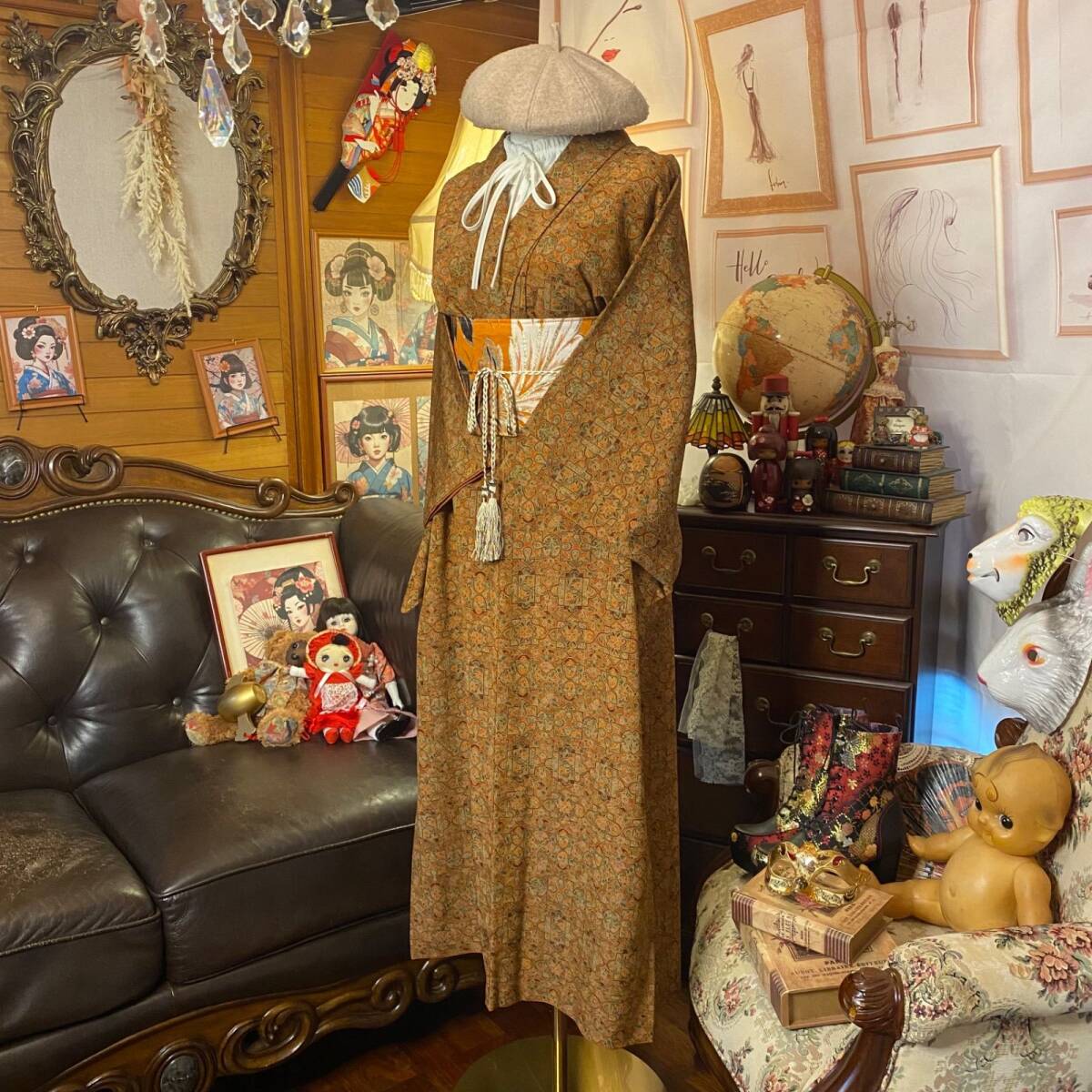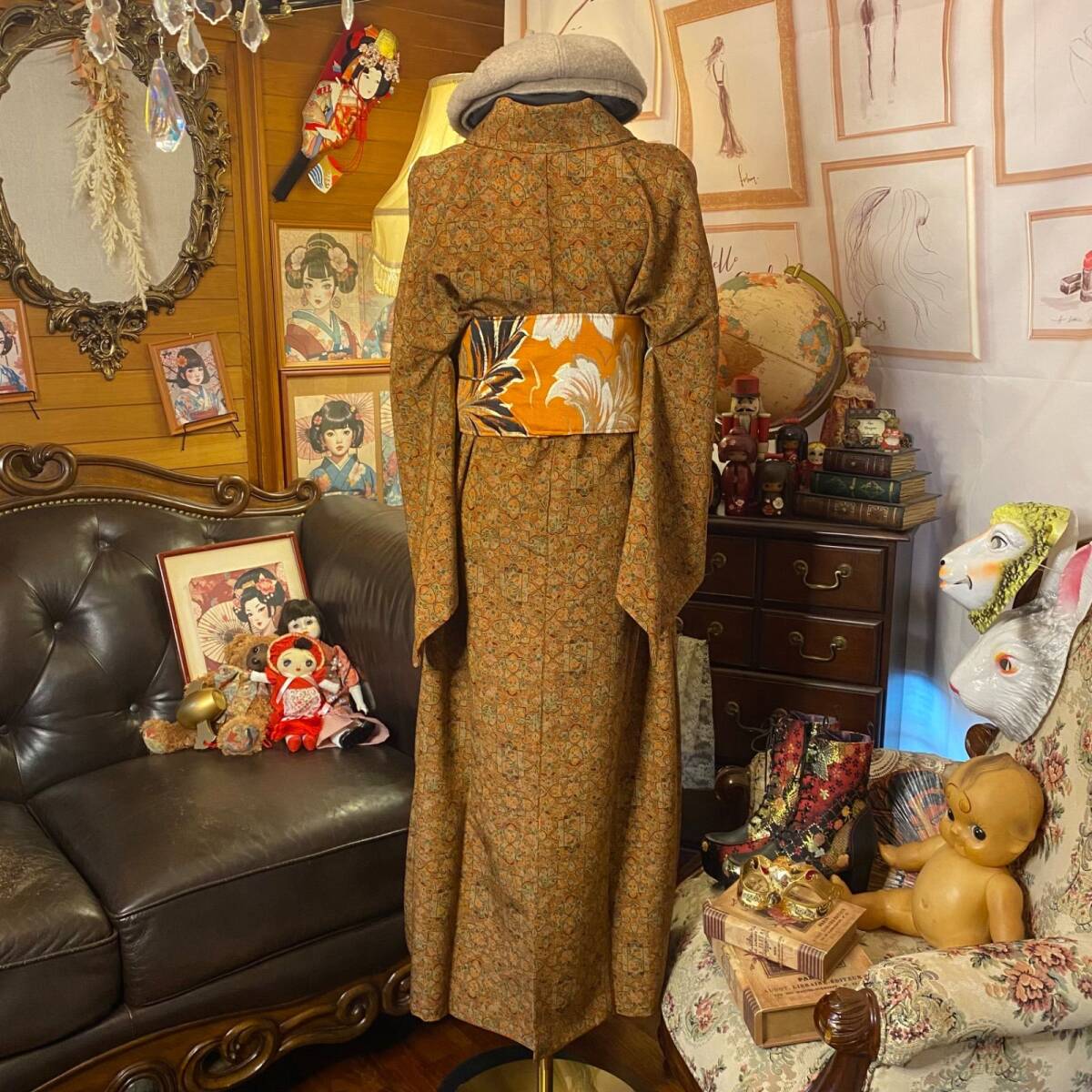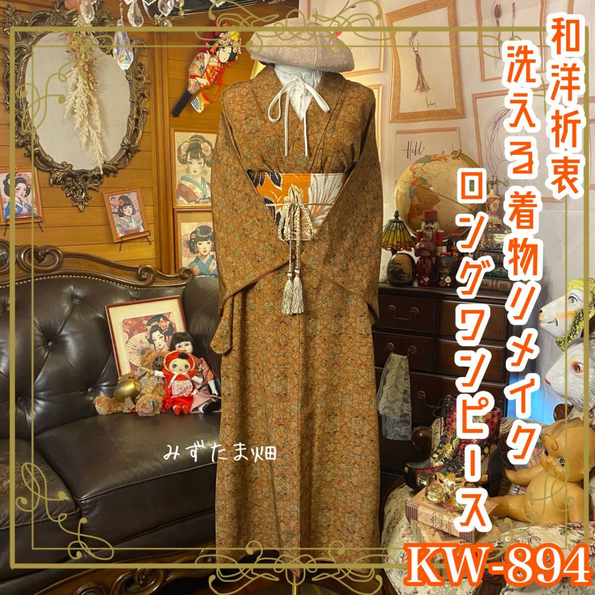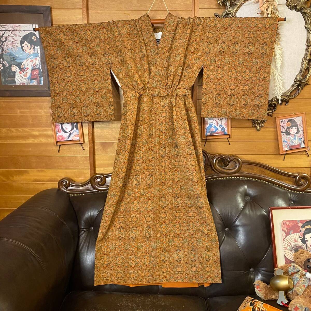 【着物 リメイク ロング ワンピース ドレス 洗える 化繊 名古屋帯ベルト 和洋折衷 レトロ 古着 ハンドメイド 温かみのあるキャラメルブラウンの地に、繊細に描かれた草花模様が広がる一着。 KW-894】