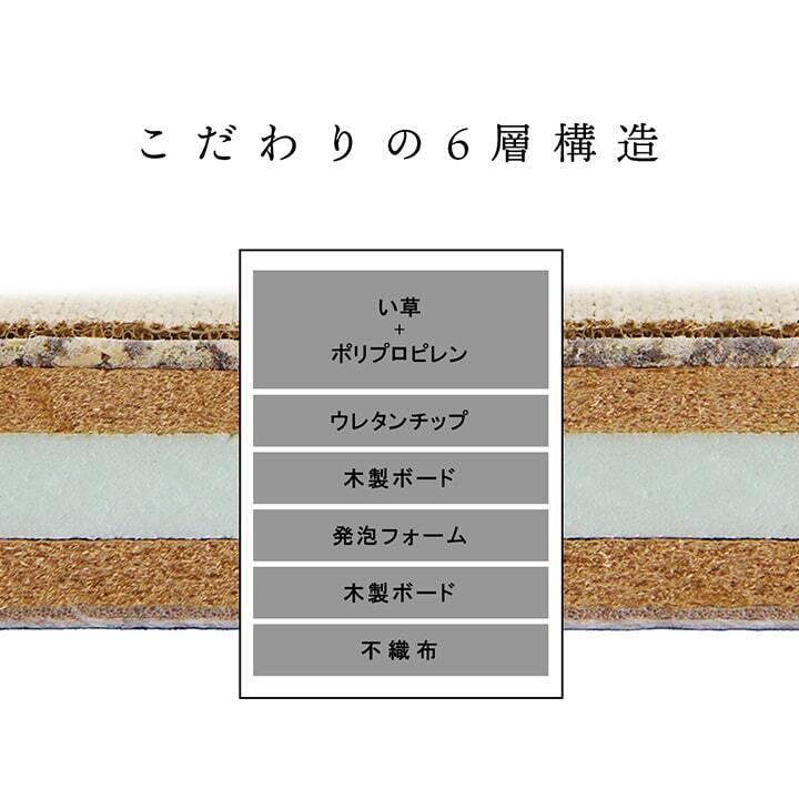 | 表地=い草+ポリプロピレン 中材=ウレタンチップ5mm・木製ボード10mm・発泡ボード15mm・木製ボード10mm 裏地=不織布 |