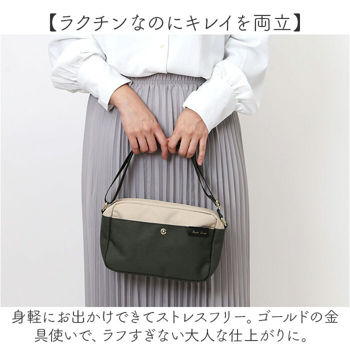 商品説明 | ・・【お仕事と家事を頑張る女性に】 ・デイリーに活躍◎「Legato Largo 撥水両立バッグ ミニショルダー」。 ・【ラクチンなのにキレイを両立】 ・身軽にお出かけできてストレスフリー。ゴールドの金具使いで、ラフすぎない大人な仕上がりに。 ・【両手が空いて移動がスマート】 ・ショルダーの長さを調節して、肩掛けや斜め掛け!アクティブに動く日も快適。 ・【ガバっと開くダブルファスナー】 ・左右どちらからもオープン。中身を確認しやすく、ファスナーを閉じればプライバシーを確保。 ・【マストアイテムをひとまとめ】 ・長財布やペットボトルが横向きに。必要な物がすっきり収まる、スリムフォルム。 ・【サクッと取り出せて迷子知らず】 ・合計5つのポケットを配置。細々した物も、バッグの中で探す手間が不要。 ・【晴れの日も雨の日も頼れる相棒】 ・汚れや水滴を弾きやすい、撥水加工を施した素材。お手入れも拭き取るだけ。 ・(※)完全防水ではありません。 ・【コーデに馴染む落ち着いたカラー】 ・どんなスタイルにも合わせやすい、ワンカラーやバイカラー。シンプルで使い勝手抜群☆ ・【ポケット仕様】 ・内側:オープンポケット×2 ・前面:マグネットポケット×1 ・背面:オープンポケット×2 |