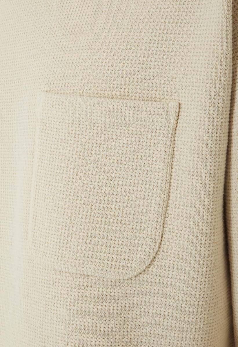 太番手の空紡糸をローゲージの編み機を使用して編み立てた特注生地です。目面の大きいローゲージの編み機で編み立てることで目の立った凹凸感のある表情です。