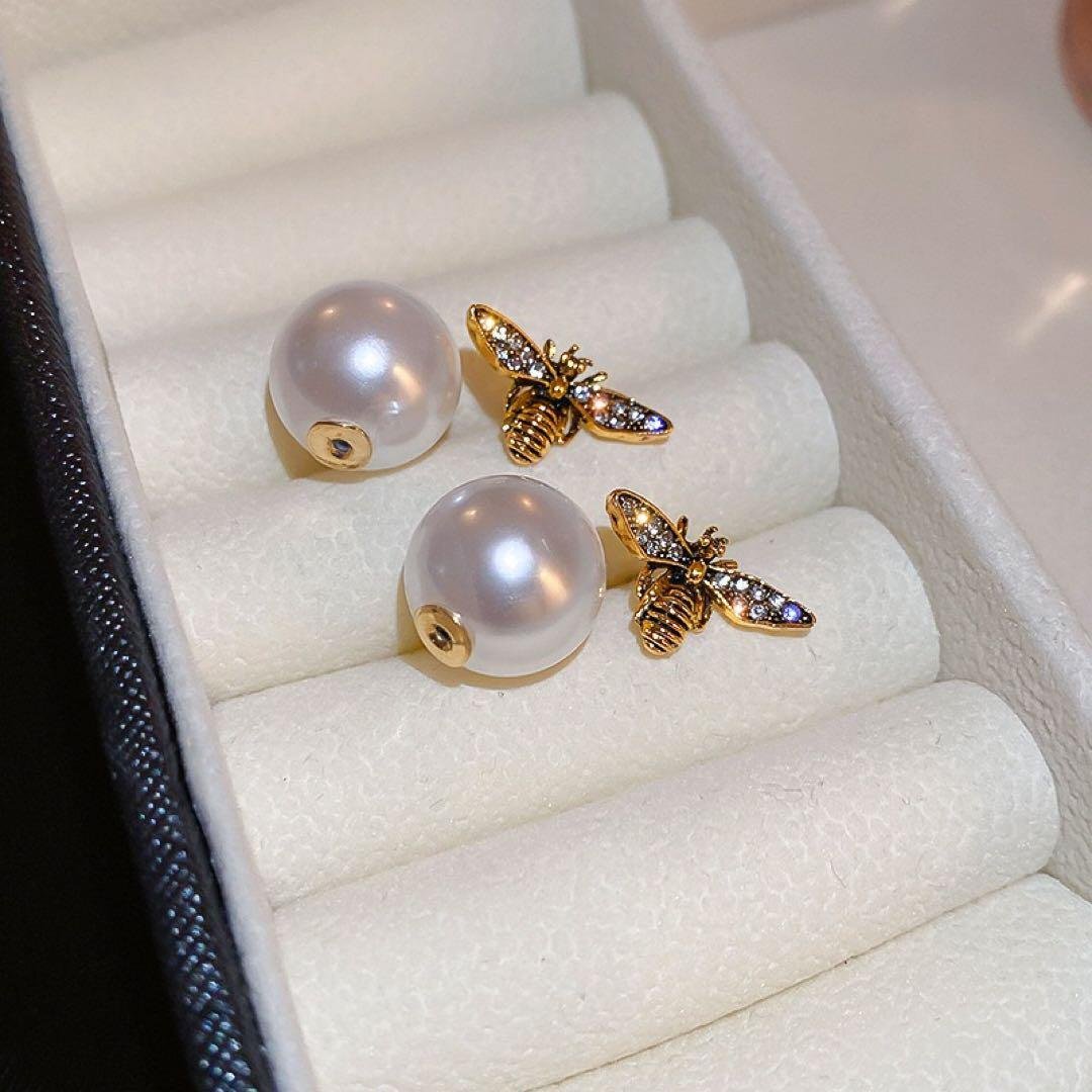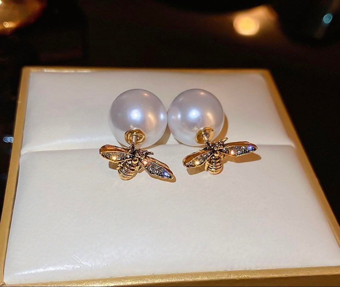 パールとハチのデザインが特徴的なピアス。おしゃれなデザイン,さまざまなコーディネートに合わせられます。