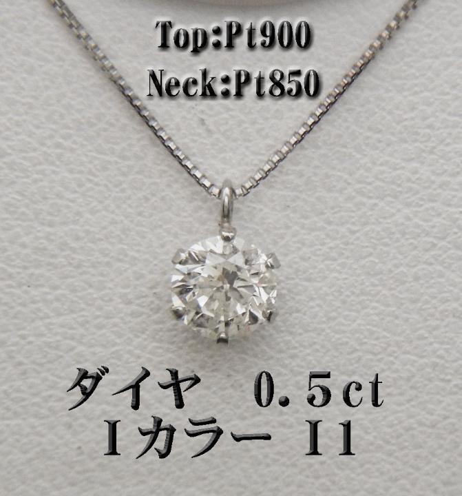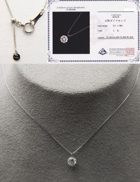 | 品名Pt900/850 ダイヤ ネックレス 石名 天然ダイヤモンド 石の重量 0.5ct 石の色: Iカラー 石の質: I1 |
