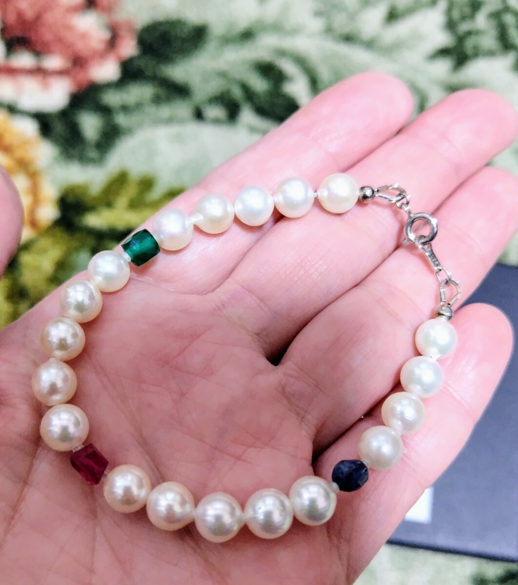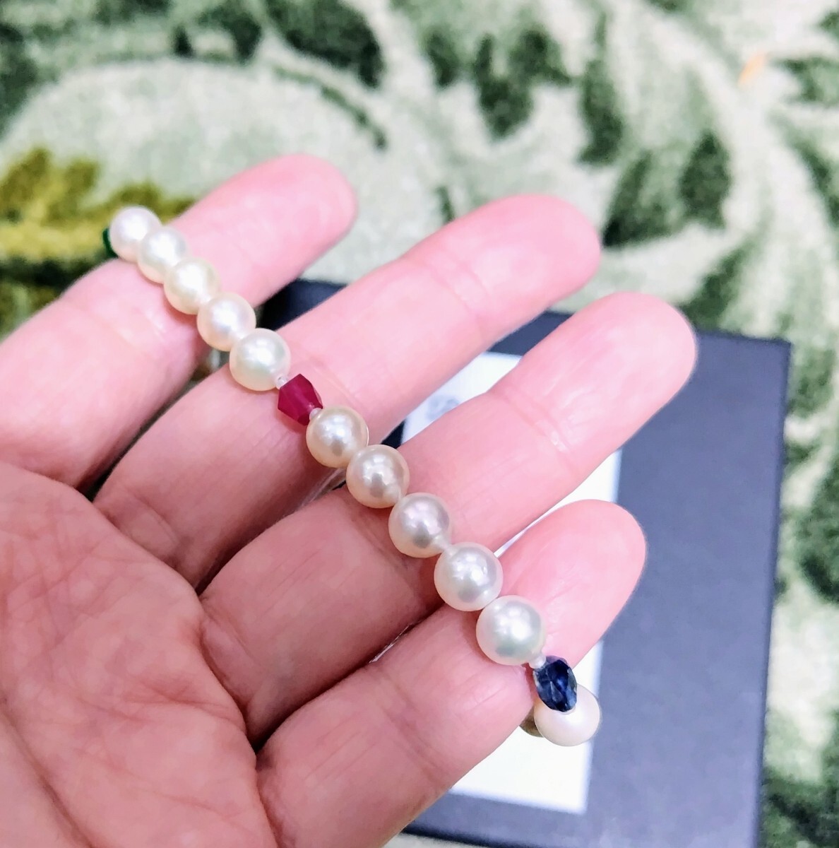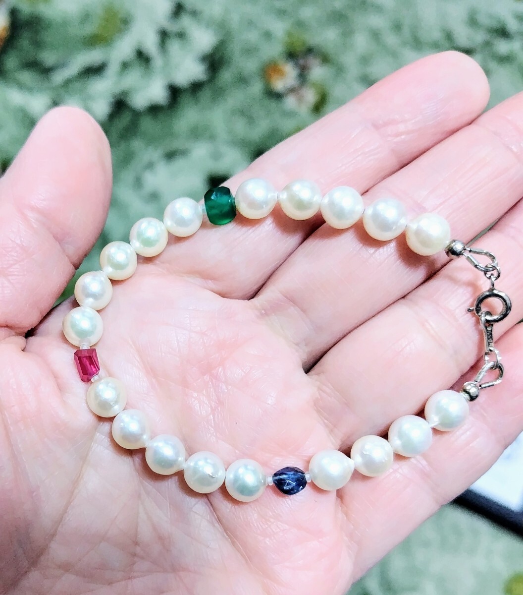 あこや真珠、ルビー、カイヤナイト、グリーンオニキス が試用されています。金具はシルバーです。