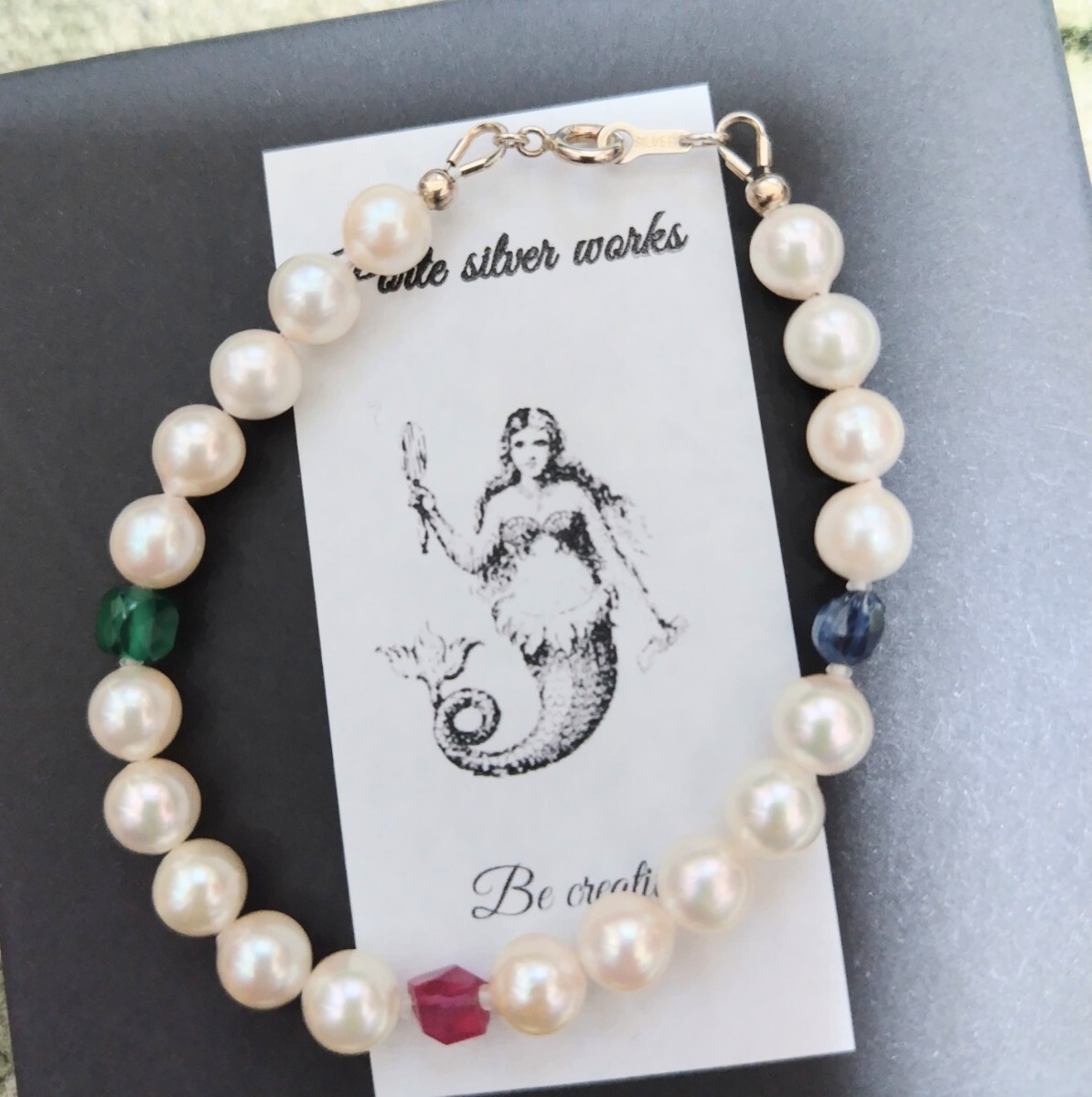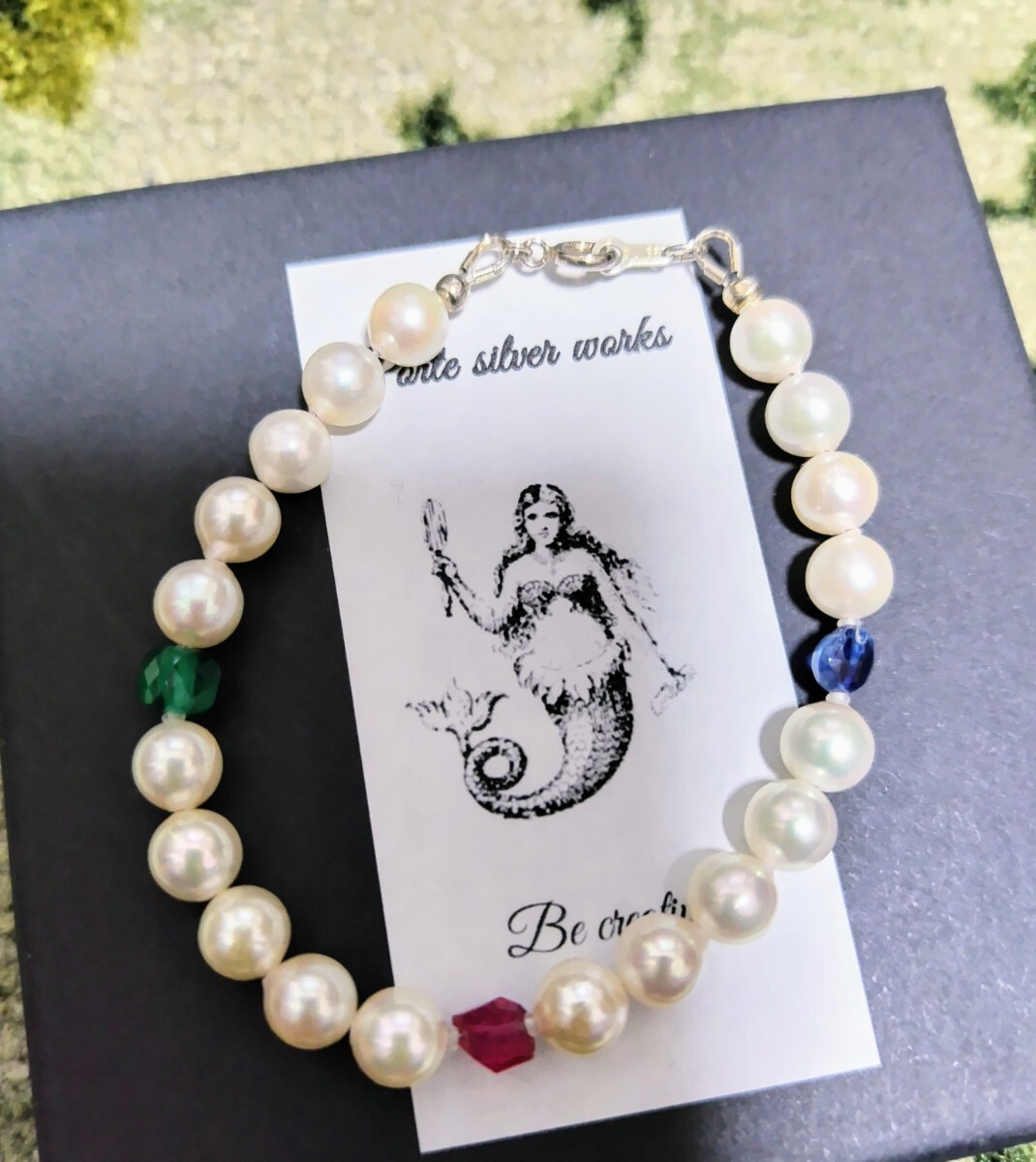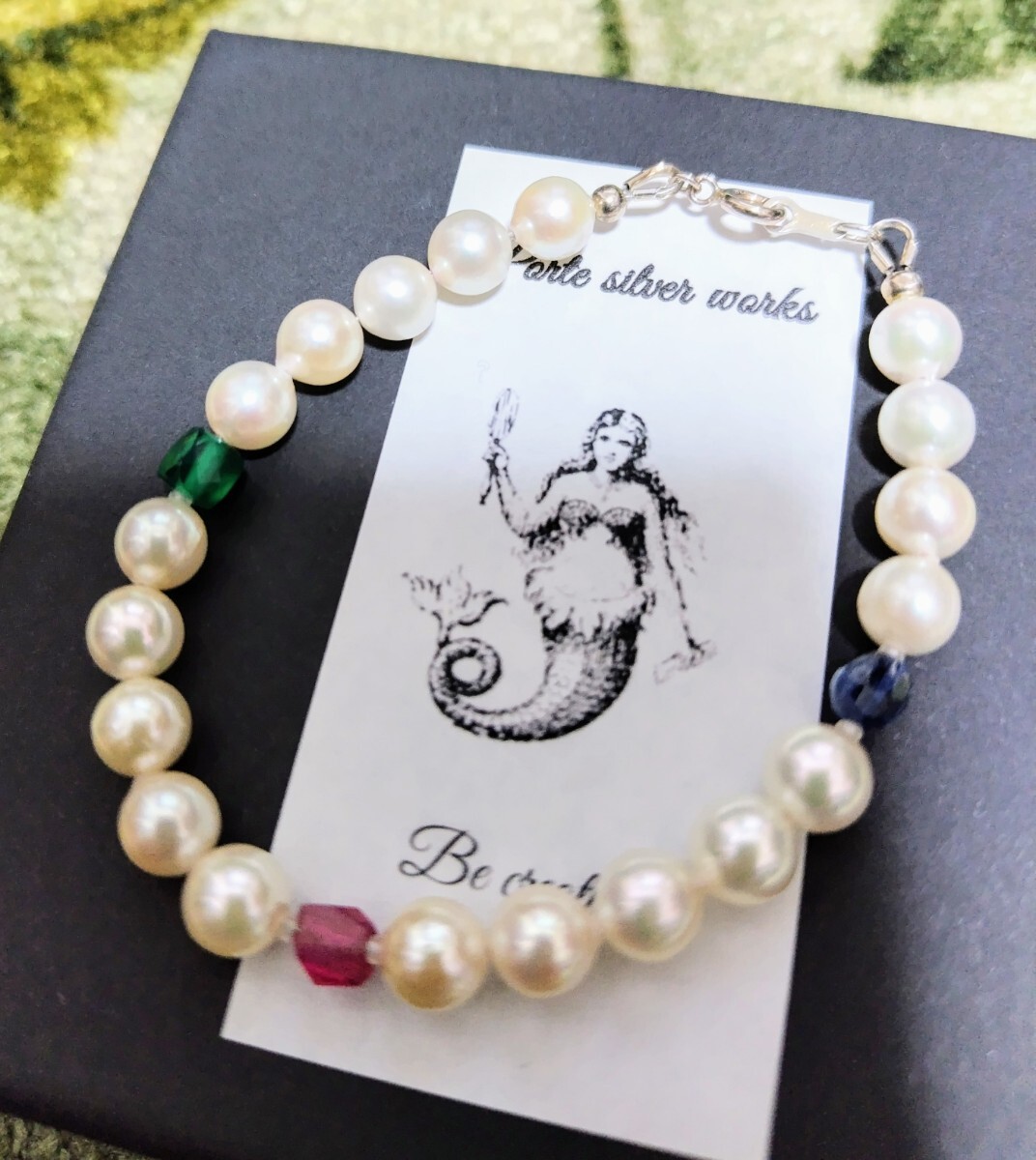 あこや真珠、ルビー、カイヤナイト、グリーンオニキス が試用されています。金具はシルバーです。