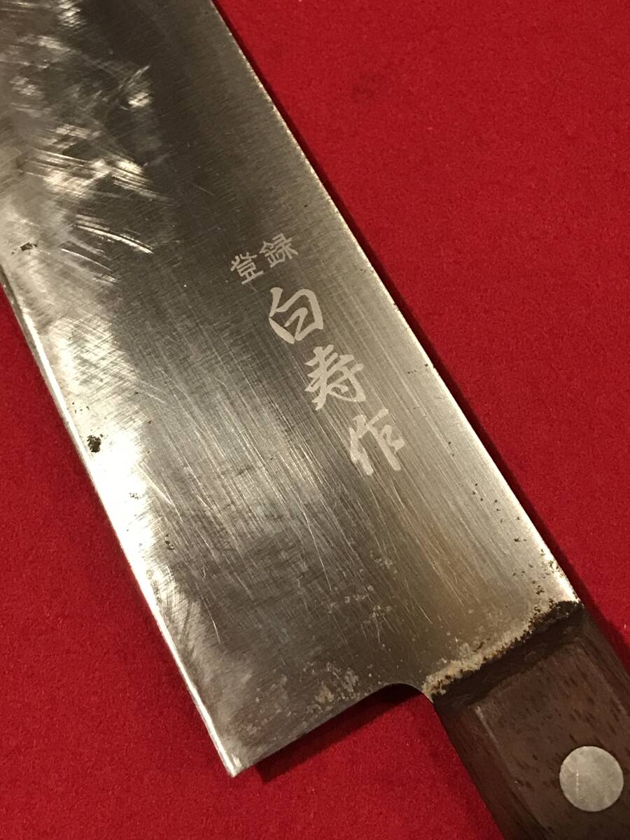 A8523●包丁 刃物 三徳包丁 白寿作 全長約29㎝ 刃渡り約17㎝ 最大幅約4.5㎝ キズ、汚れ、使用感などあり 中古。
