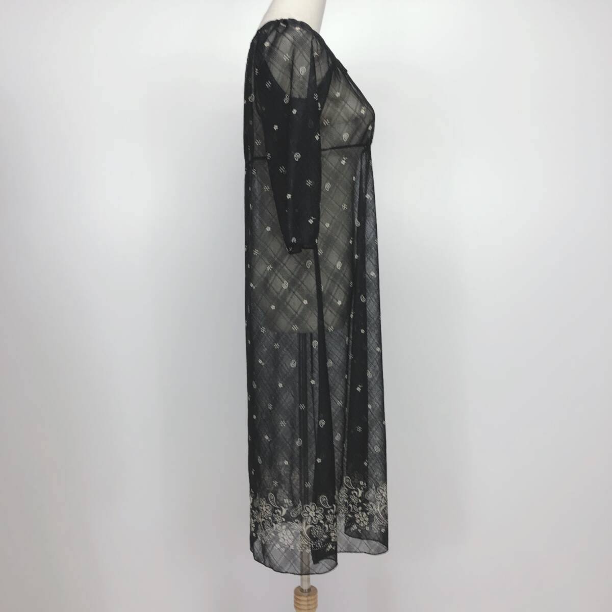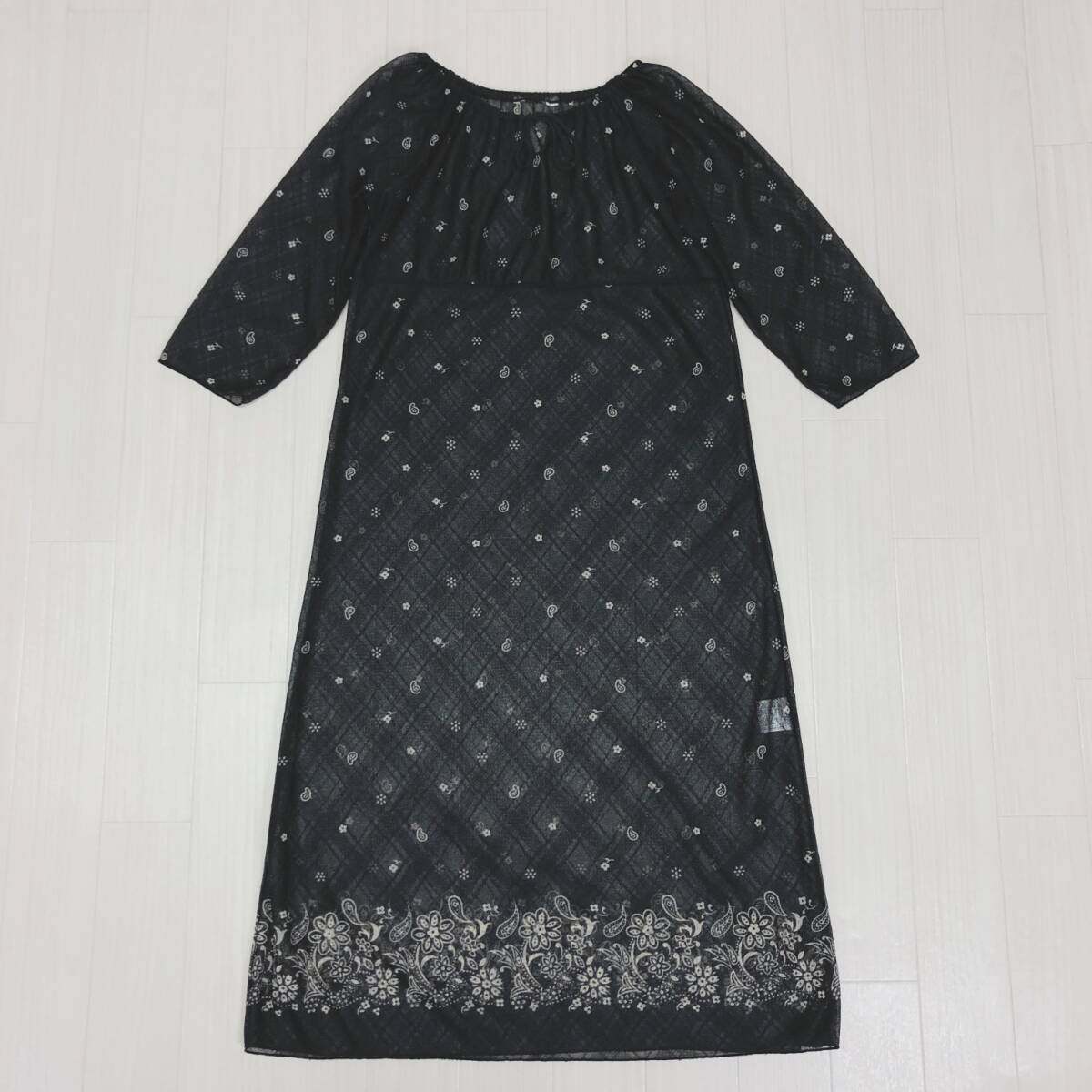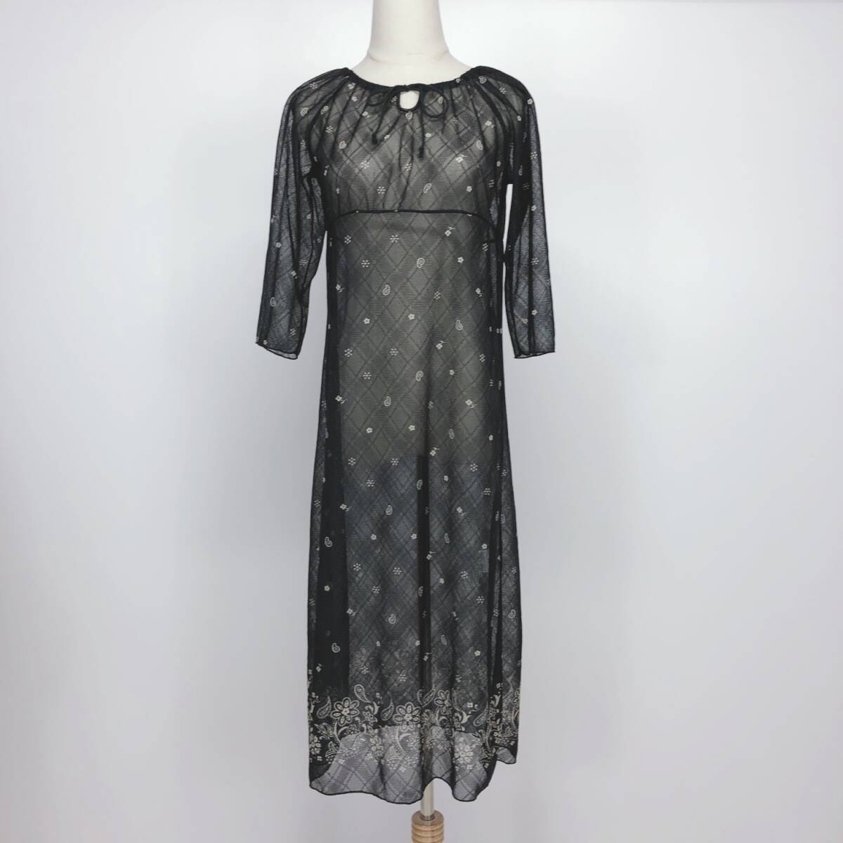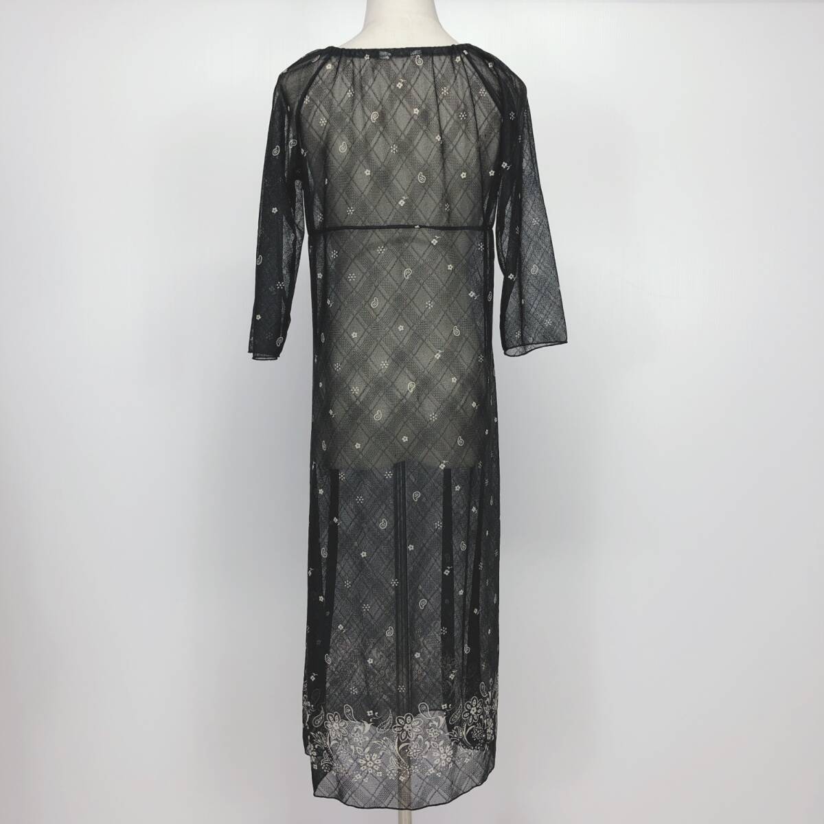 YX1103 美品 レディースワンピースひざ丈ワンピース膝丈薄手 紐付 レース シースルー サイズM ブラック 黒 花柄 シンプル シック 涼しげ 夏