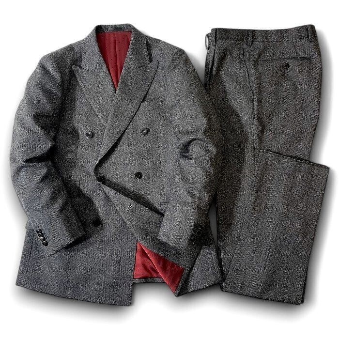 ジャケット:6Bダブル・総裏地・サイドベンツ・仮切羽・内ポケット×4・外ポケット×4 パンツ:ジップフライ・ワンタック・裾未処理・4ポケット・ウエスト4cm出し可能 |
