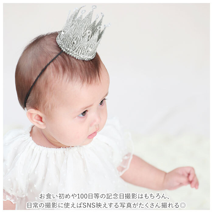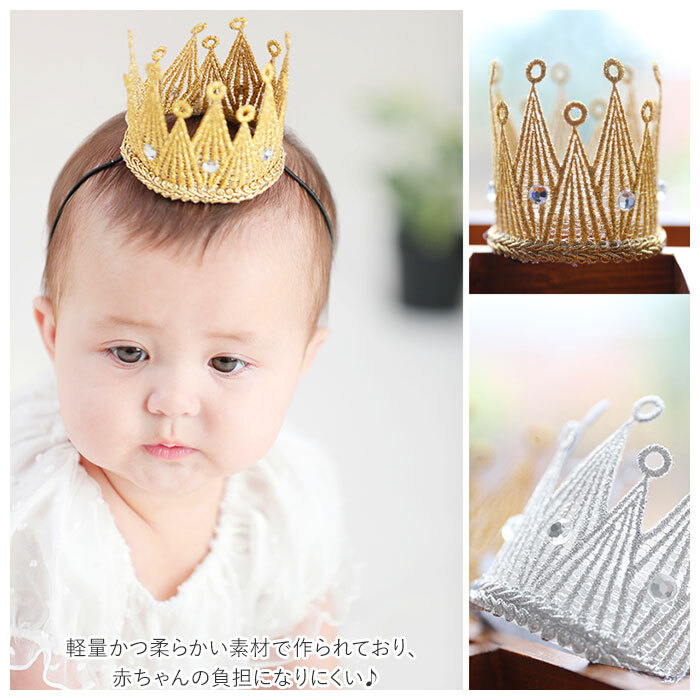 | 商品説明 | ・・記念日の撮影におススメ♪ベビー用クラウン型ヘアアクセサリーが登場。 ・ちょこんと可愛いサイズのクラウンにキラリと光るラインストーンを施した、おしゃれで可愛いアイテム。 ・締めつけ感のないゴム紐で、付け外しがラクチン。 ・軽量かつ柔らかい素材で作られており、赤ちゃんの負担になりにくい♪ ・お食い初めや100日等の記念日撮影はもちろん、日常の撮影に使えばSNS映えする写真がたくさん撮れる◎ |