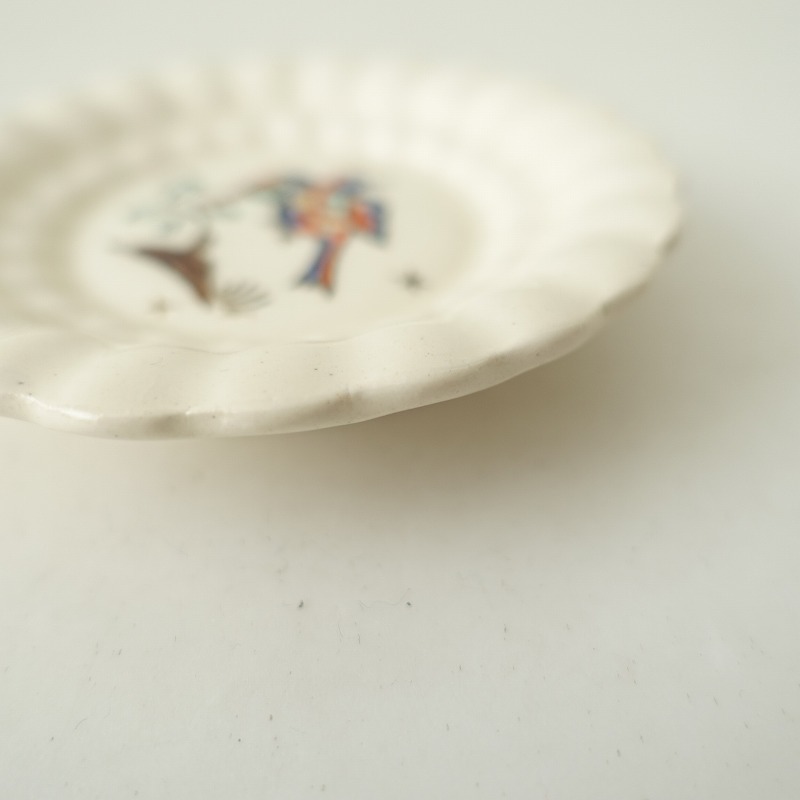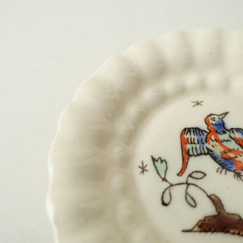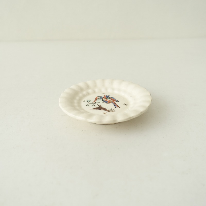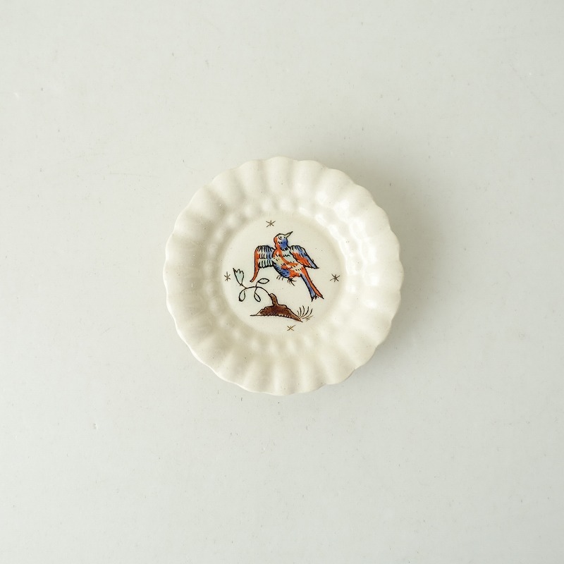 | 高島大樹さんのオランダ豆皿 9cmです。 鮮やかな色彩の羽根を持つ鳥が描かれた小皿です。シンプルでありながらどこか個性的なデザインが特徴です。 和洋問わずさまざまなテーブルコーディネートに馴染むお品物です。 |