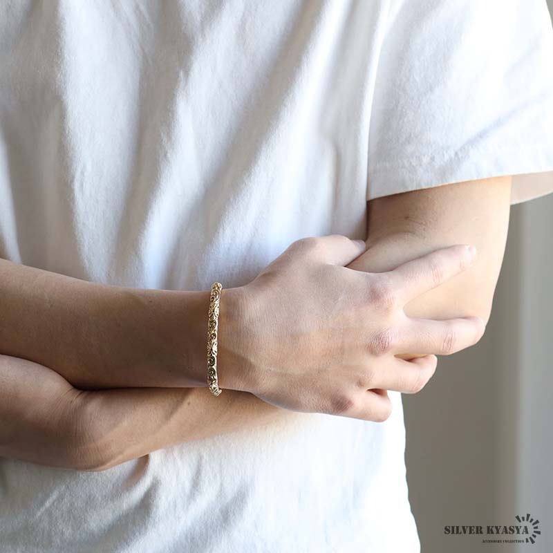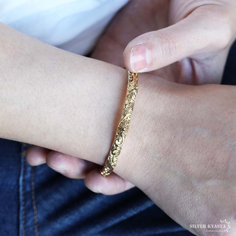 唐草とクロスを繊細に彫刻したバングル。ゴールドカラーと相性抜群で高級感漂います。程よいサイズで普段のファッションに馴染みやすい。