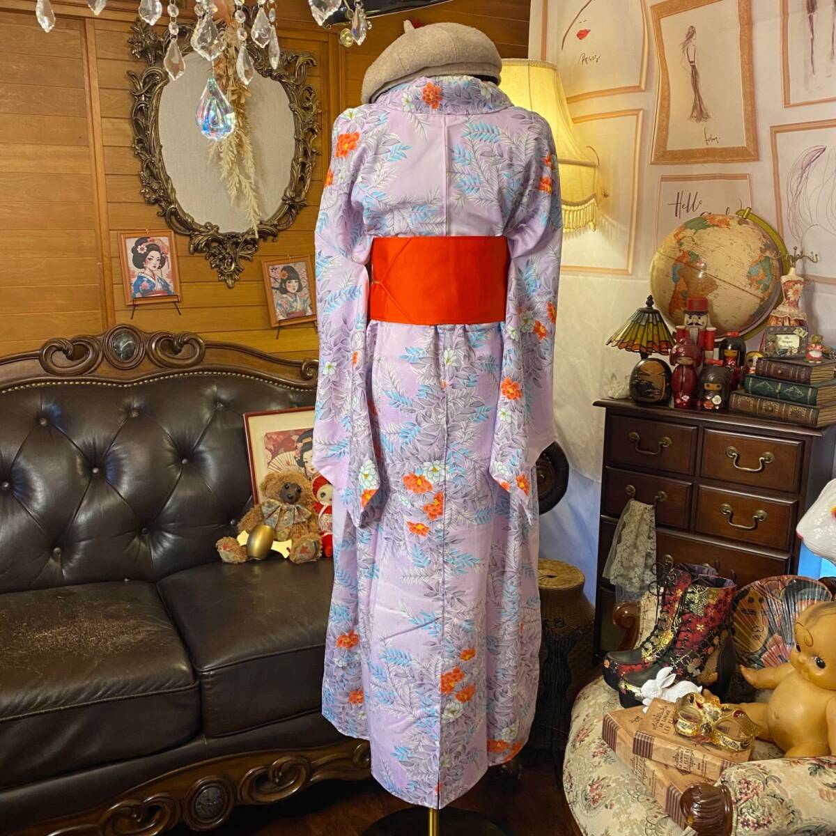 和洋折衷スタイル:伝統的な着物の華やかさと、現代的なワンピースデザインが調和。