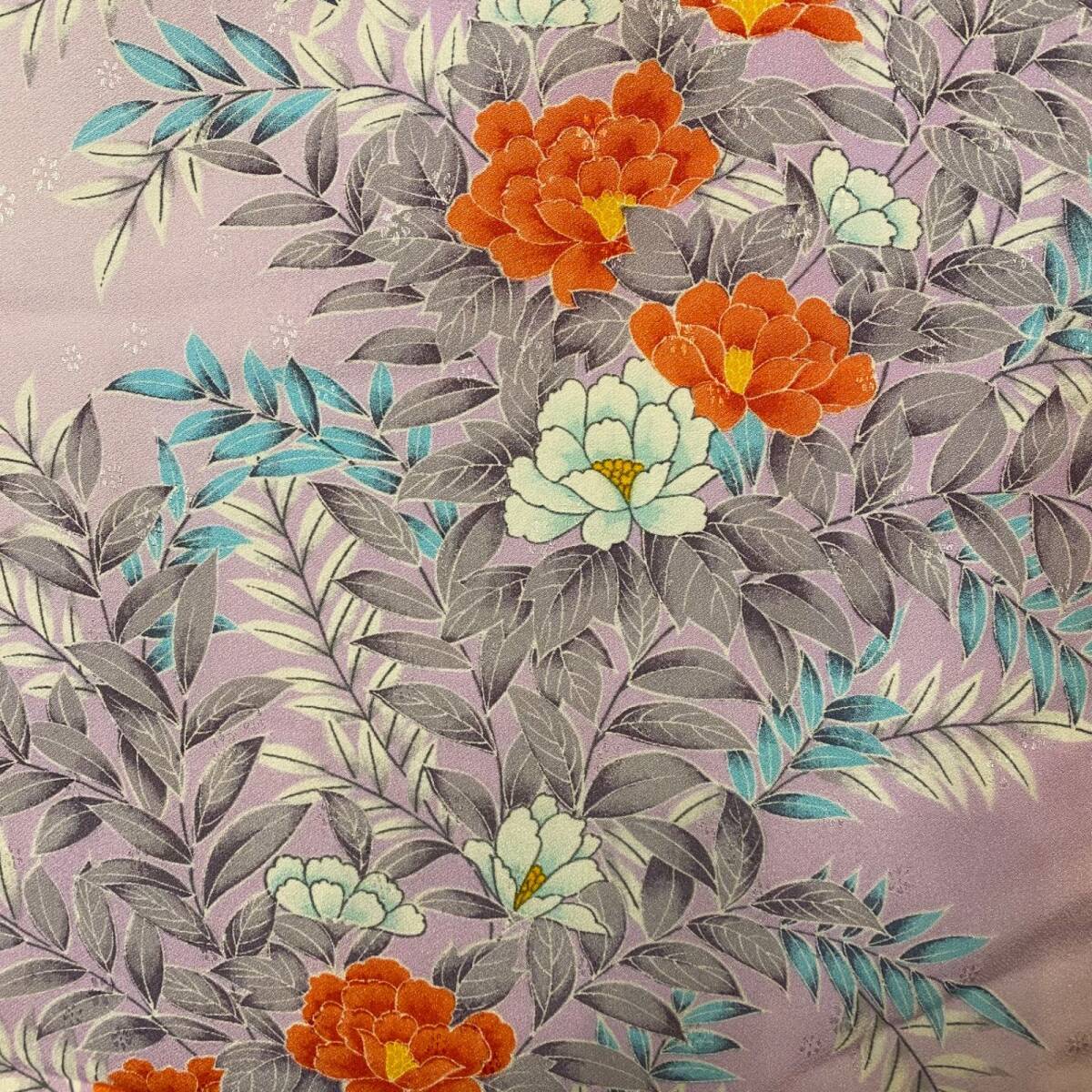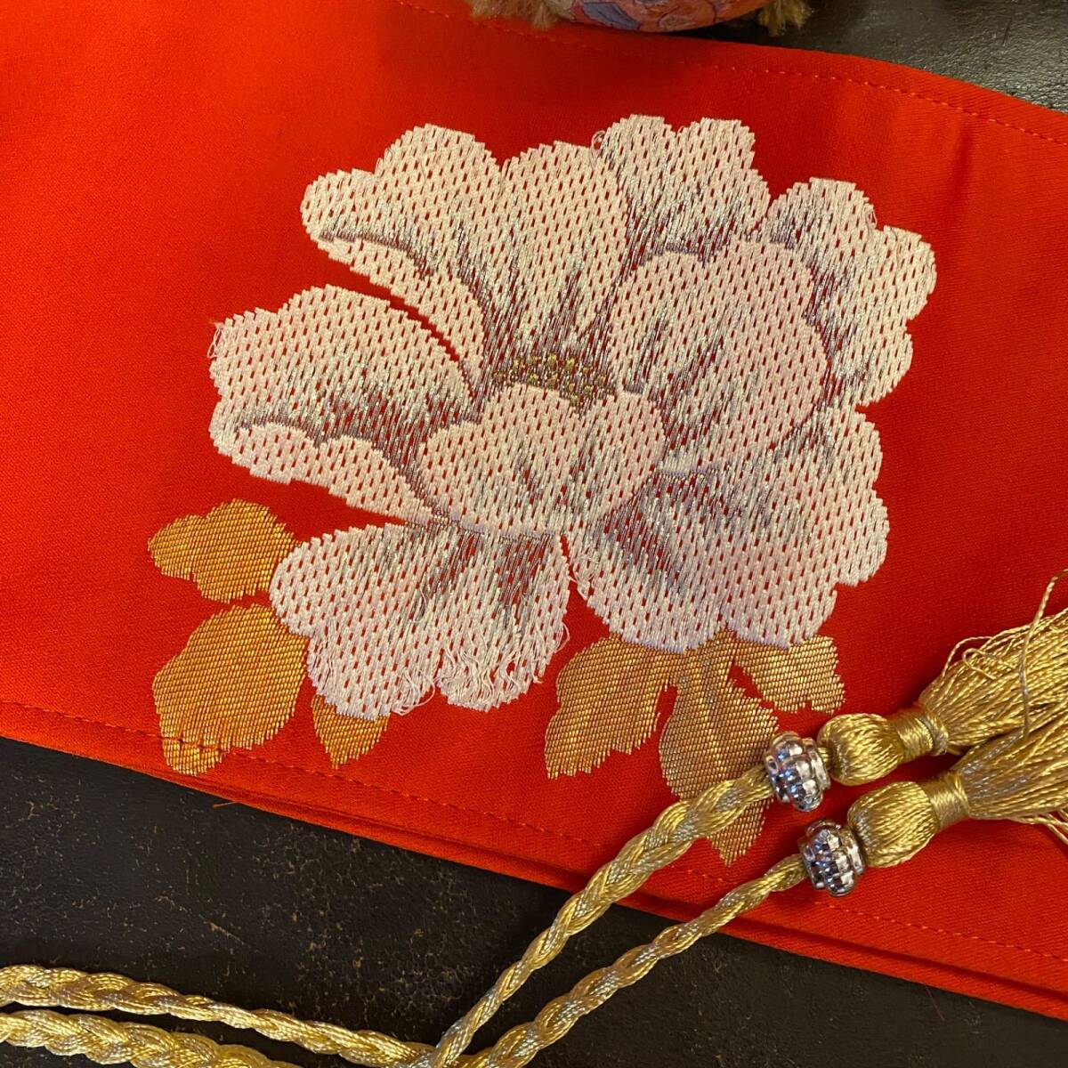 艶やかな緋色の地に白牡丹が咲いています。