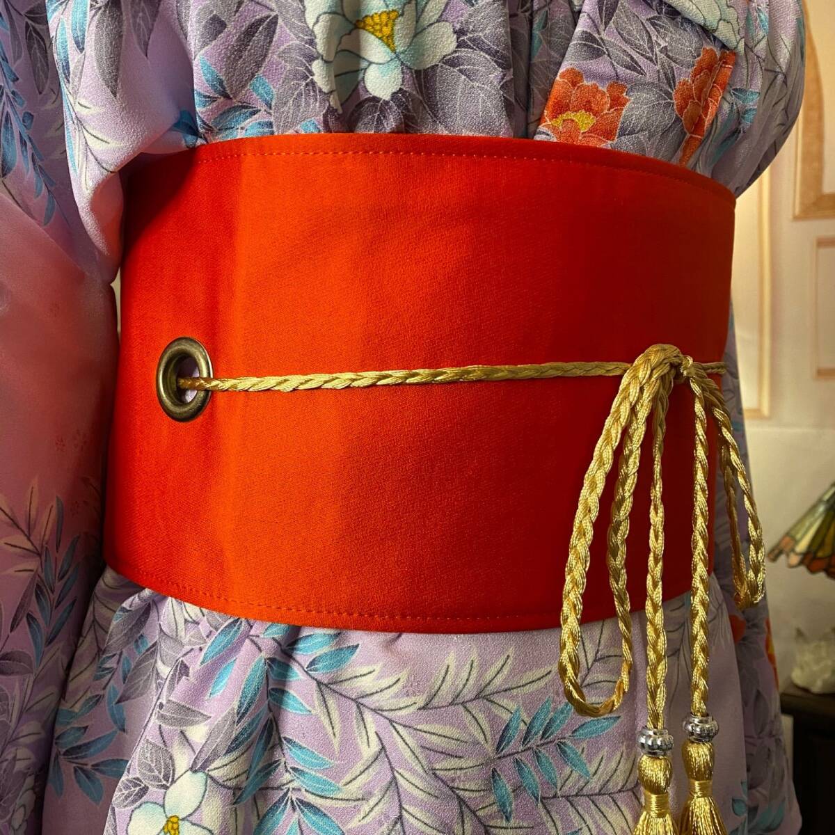 着崩れ防止、強度を持たせるために太めのウエストゴムを使用しております。また、お着物の形を最大限に活用した特性上、ウエスト部分の布が厚くなっています。付属の帯ベルト等を装着するとお写真の様に目立ちません。