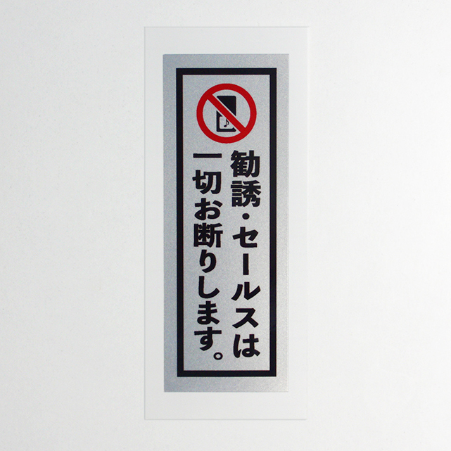 呼び鈴やドアの付近に貼るだけで、煩わしい勧誘やセールスの来訪が 減少します。 <高耐久性シートを使用> 高耐水・高耐候性に優れた材質を使用の上、UVカット95%以上のコーティングを施して製作をしていますので 屋外での使用も大丈夫です! ・高級感のあるメタリックシルバーのステッカーです。 (同じデザインのゴールドタイプも出品しています) ・強粘着タイプですので、しっかりと貼る事ができます。 ・サイズは縦100mmX横37mmです。 (他のサイズも多数ございます。ご希望のサイズがございましたら、お気軽にお問い合わせ下さい) ・送料込み価格です(普通郵便の場合) ・ 防犯ステッカー・セキュリティステッカー他にも多数出品しています!