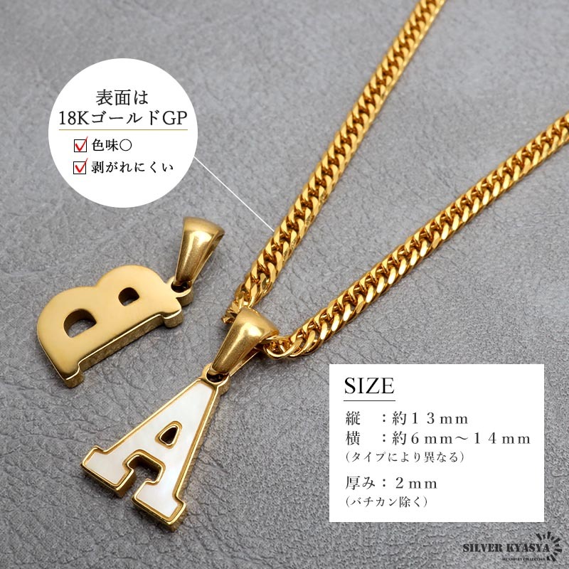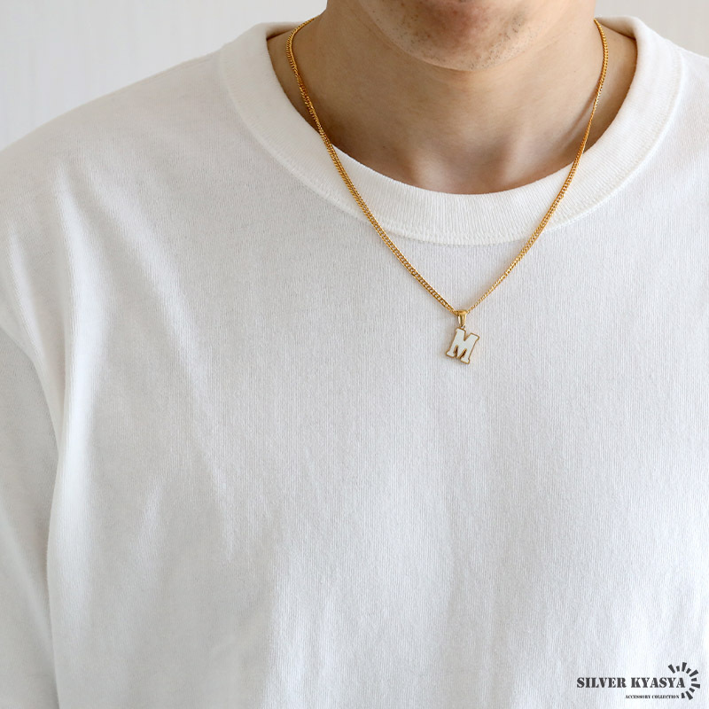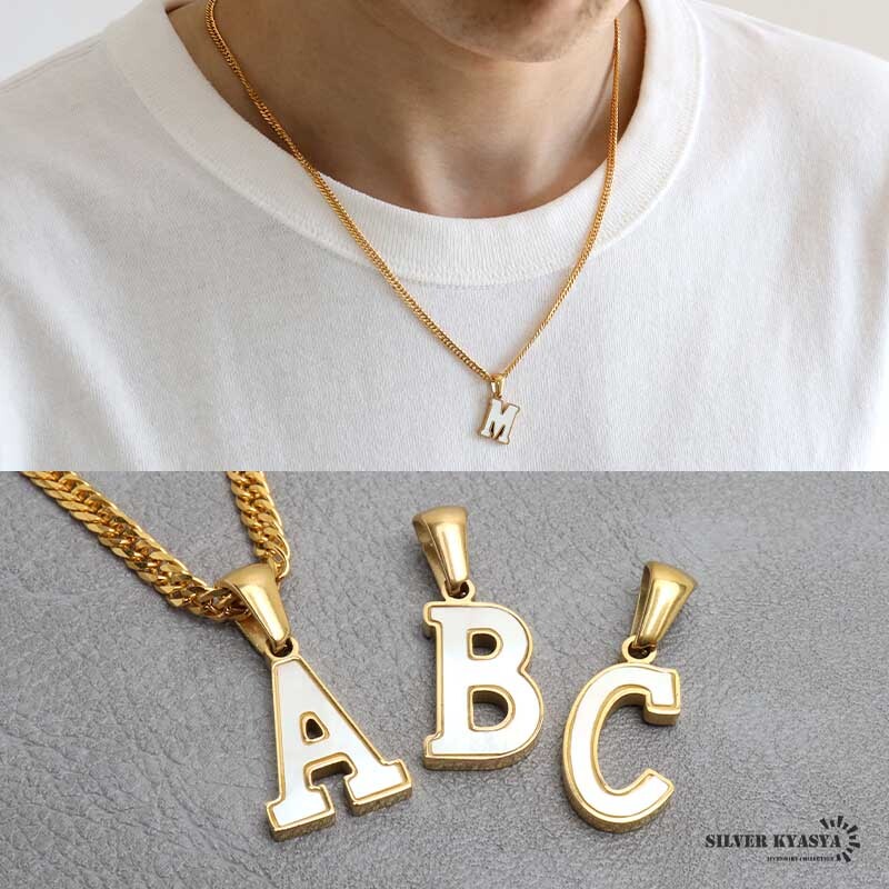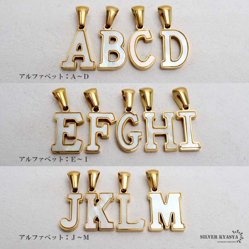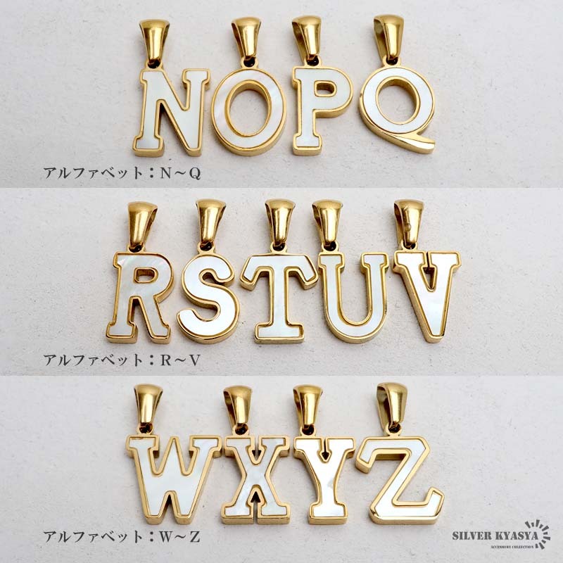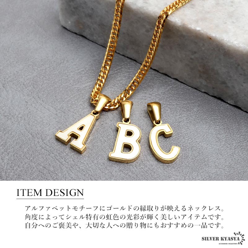 アルファベットモチーフにゴールドの縁取りが映えるネックレス。角度によってシェル特有の虹色の光彩が輝く美しいアイテムです。自分へのご褒美や、大切な人への贈り物にもおすすめの一品です。