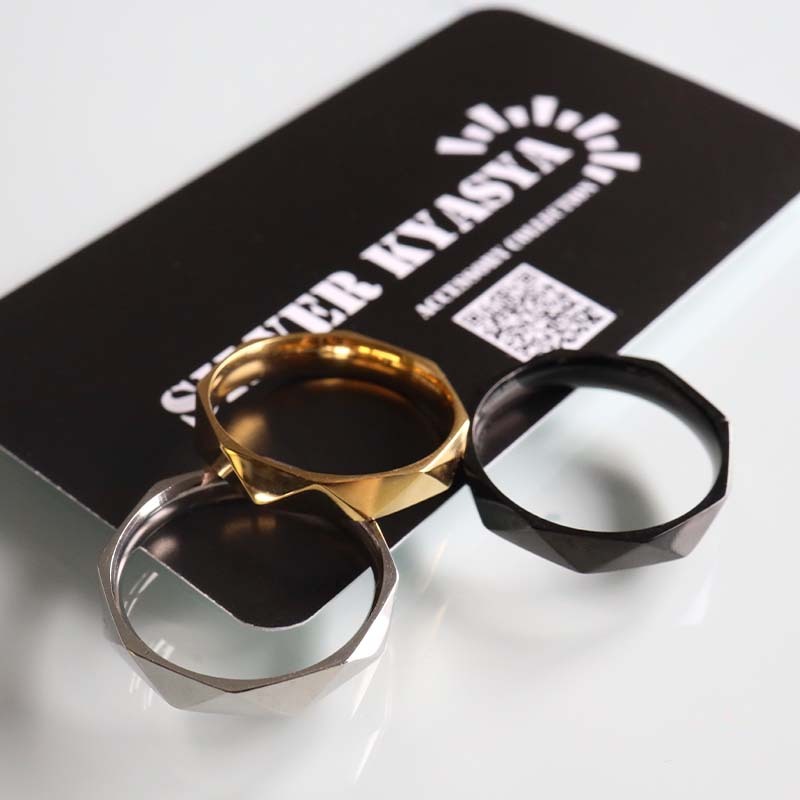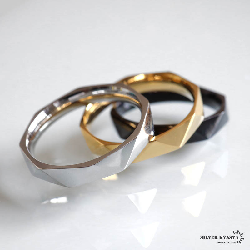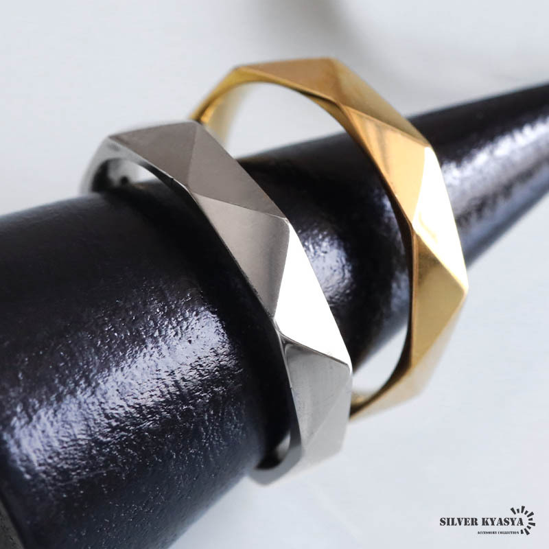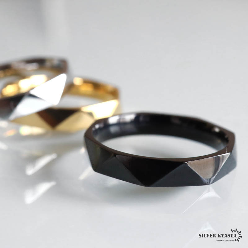 三角形の面を幾つも施したカットリング。面による光の反射がとても魅力的な逸品です。シンプルなデザインなので重ね付けはもちろん、様々なデザインのリングと合わせられるアイテムです。