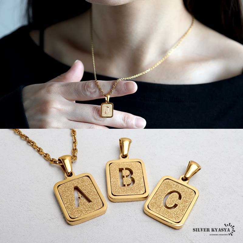アルファベットのくり抜きがお洒落なイニシャルネックレス。スクエアプレートにはグリッター加工を施し、キラキラと輝きます。自分へのご褒美や、大切な人への贈り物としてもおすすめ。