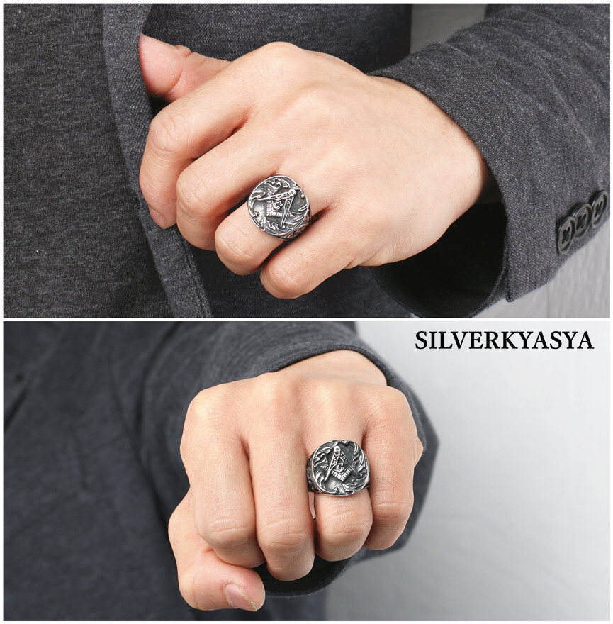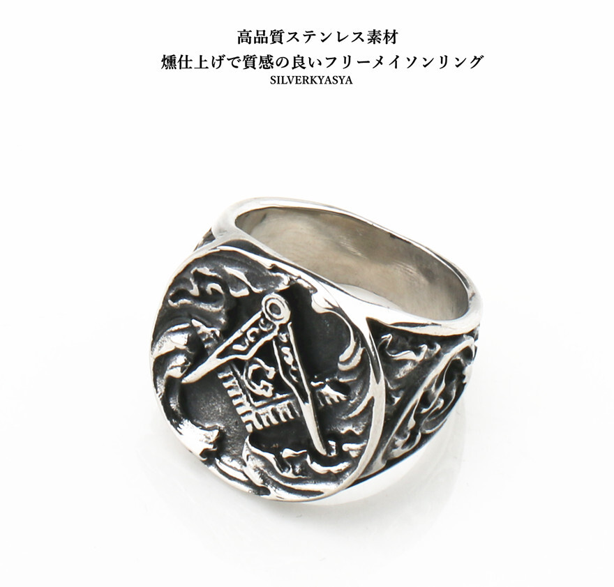 フリーメイソン&唐草模様を繊細に彫り込まれた高品質ステンレスリング!