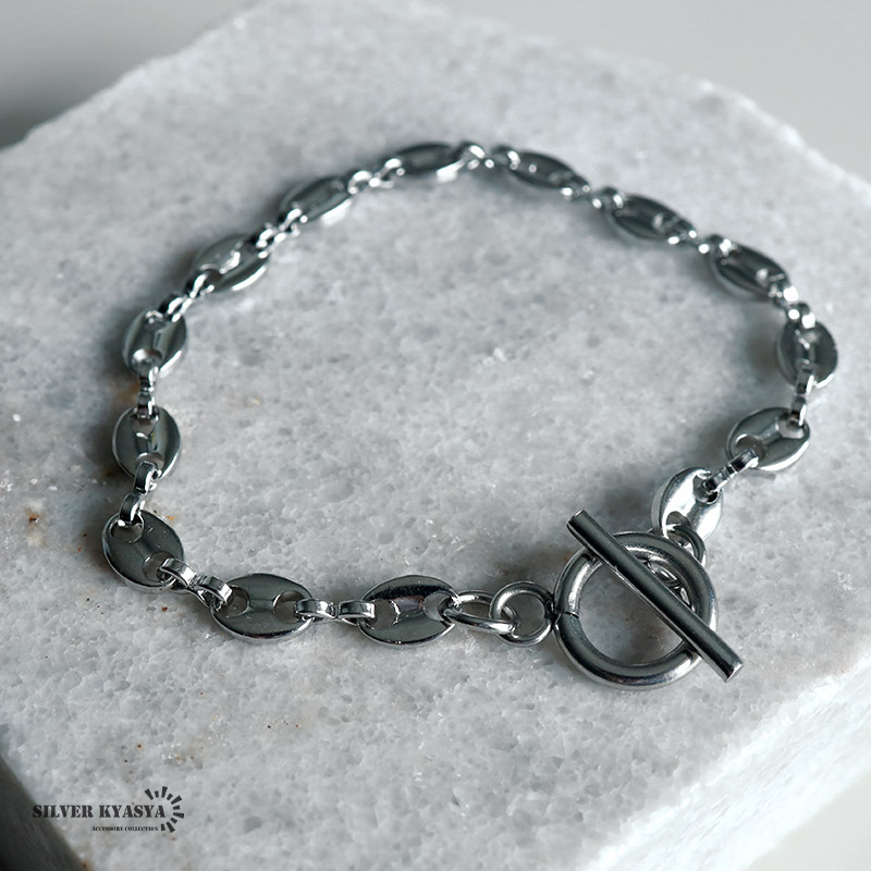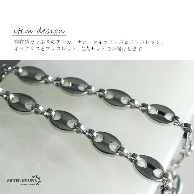 お洒落なデザインのアンカータイプのチェーンアイテム。留め具は人気のマンテルタイプです。ブレスレットとネックレスのセットで統一感あるスタイルを楽しめます。