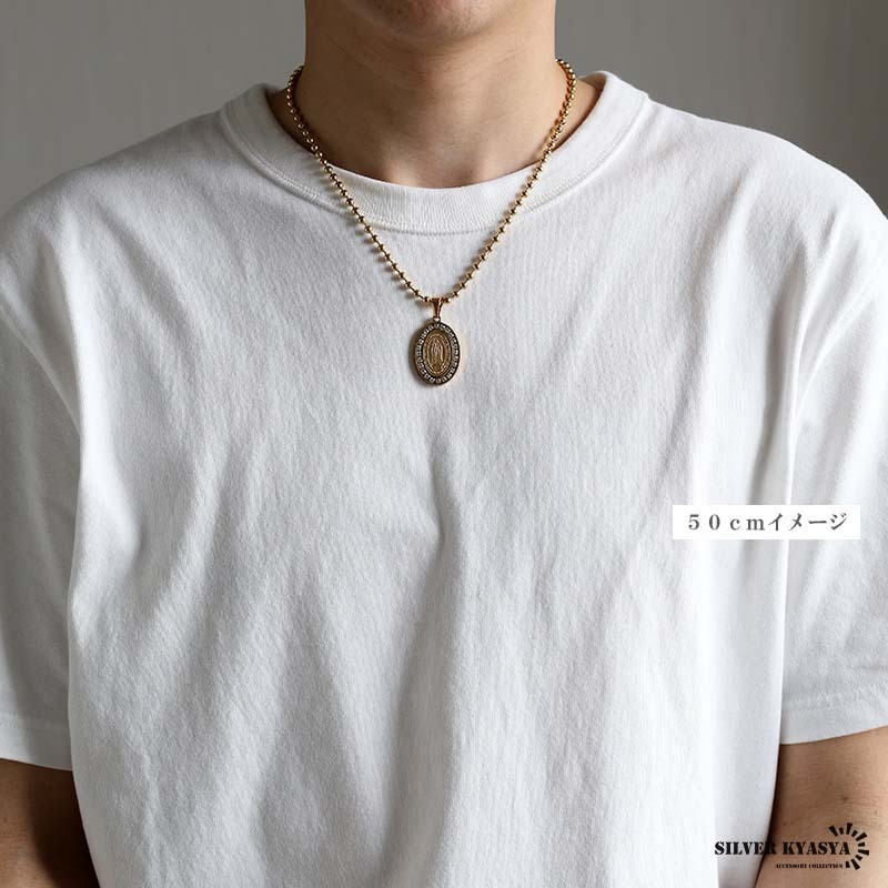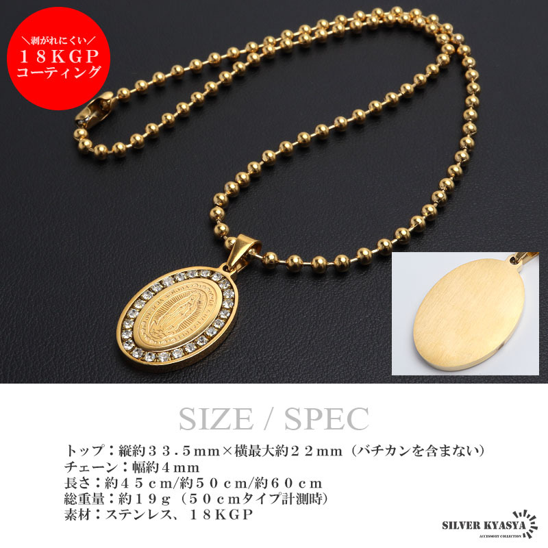 | サイズ | トップ:縦約33.5mm×横最大約22mm(バチカンを含まない) チェーン:幅約4mm 長さ:約45cm/約50cm/約60cm 総重量:約19g(50cmタイプ計測時) |