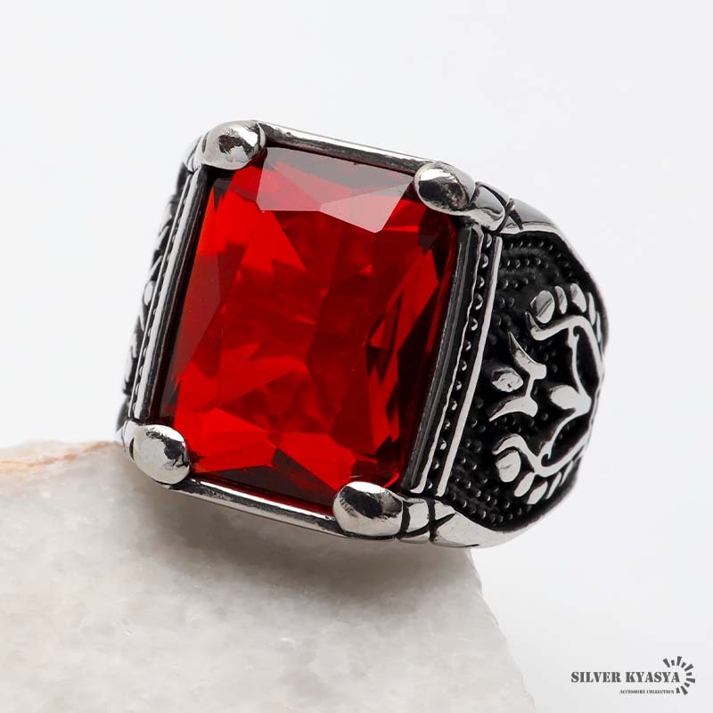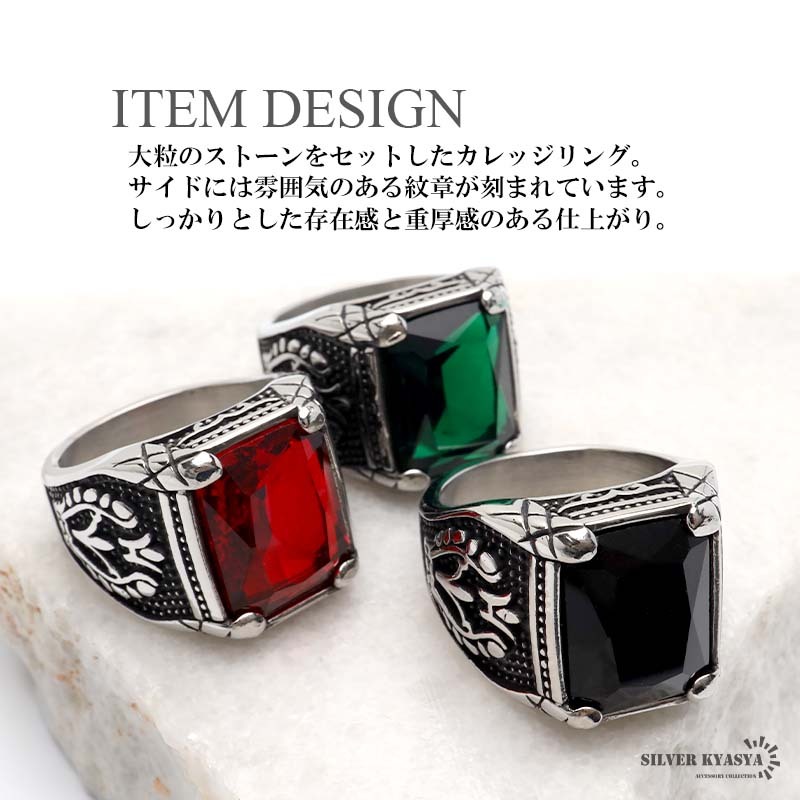 大粒のストーンをセットしたカレッジリング。サイドには雰囲気のある紋章が刻まれています。しっかりとした存在感と重厚感のある仕上がり。